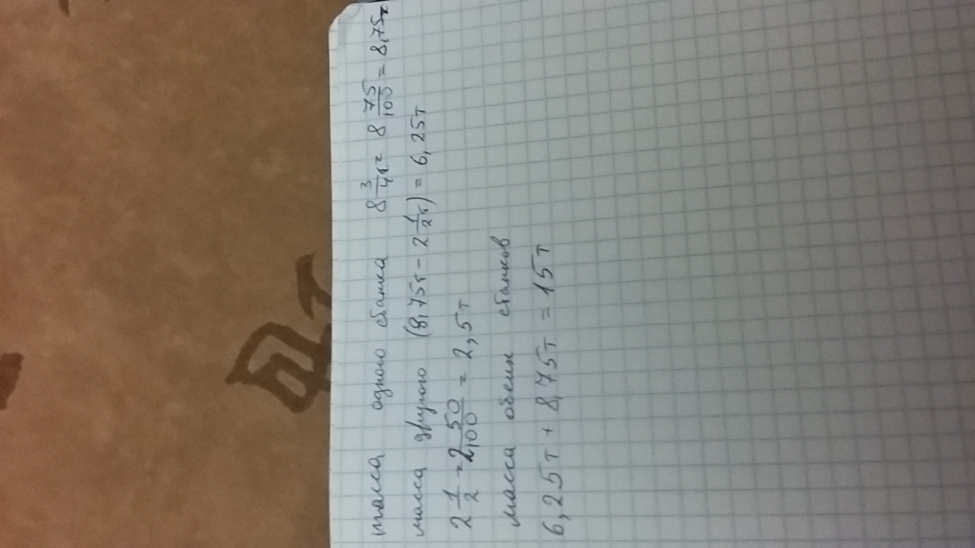 помогите решить задачу масса одного станка 8 3/4 т.,а другого на 2 1/2 т. меньше. Найти общую массу обеих станков