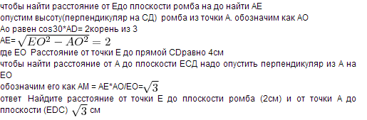 ответ Найдите расстояние от точки E до плоскости ромба (2см) и от точки A до плоскости (EDC) см