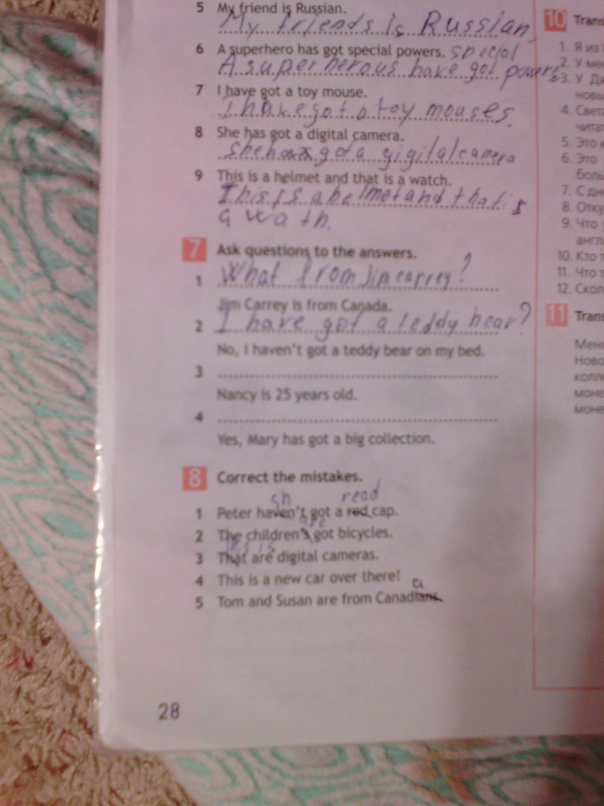 задай вопрос по ответам ( Jim Carrey is from Canada),, (No, i heven't got a teddy bear on my bed),,(Nancy is 25 years old),,(Yes, mary has got a big collection.)