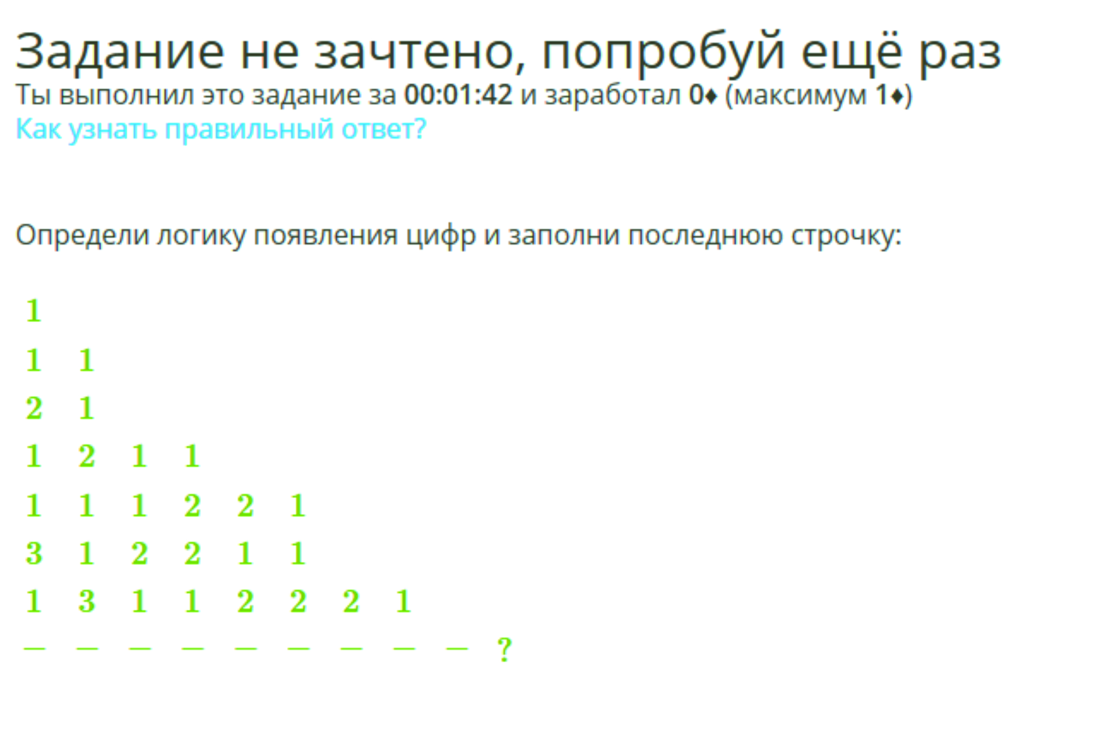1211- одна 2-ка, одна 1-ца ( значит в предыдущей строке одна 2-ка и одна 1-ца)
