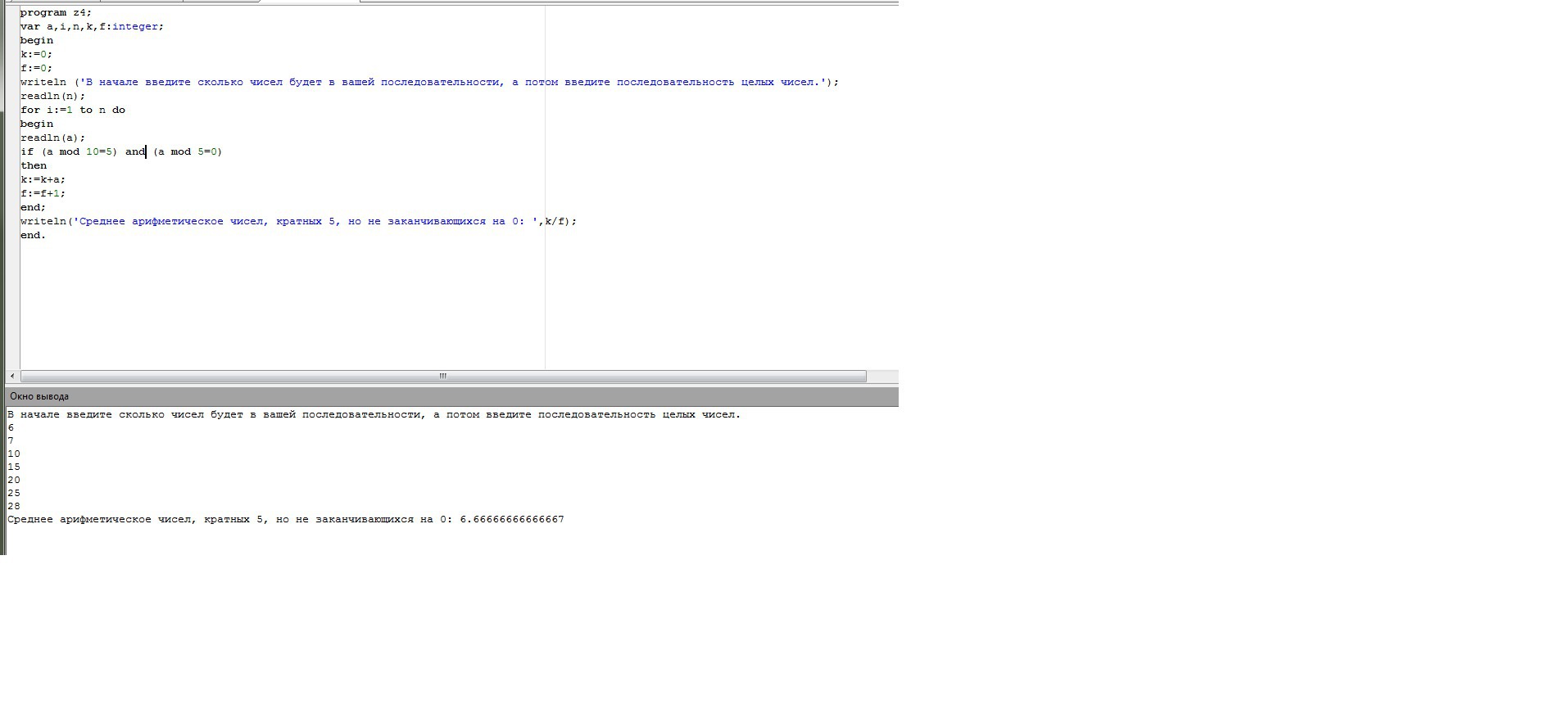 writeln('Среднее арифметическое чисел, кратных 5, но не заканчивающихся на 0: ',k/f);