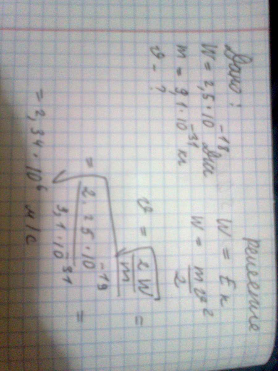 Какой минимальной скоростью должен обладать электрон, чтобы при столкновении с молекулой водорода ионизировать её, если энергия ионизации W=2,5 10^-18 Дж?