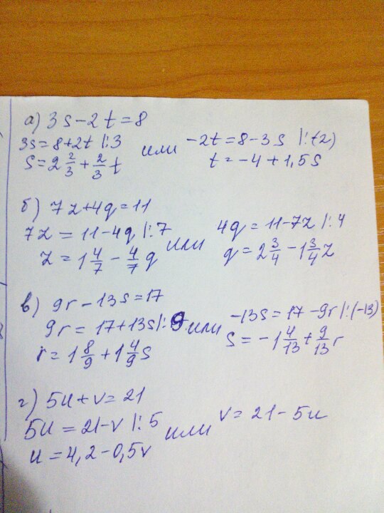 в заданном уравнении выразите одну переменную через другую а)3s-2t=8 6)7z+4q=11 в)9r-13s=17 г)5u+v=21