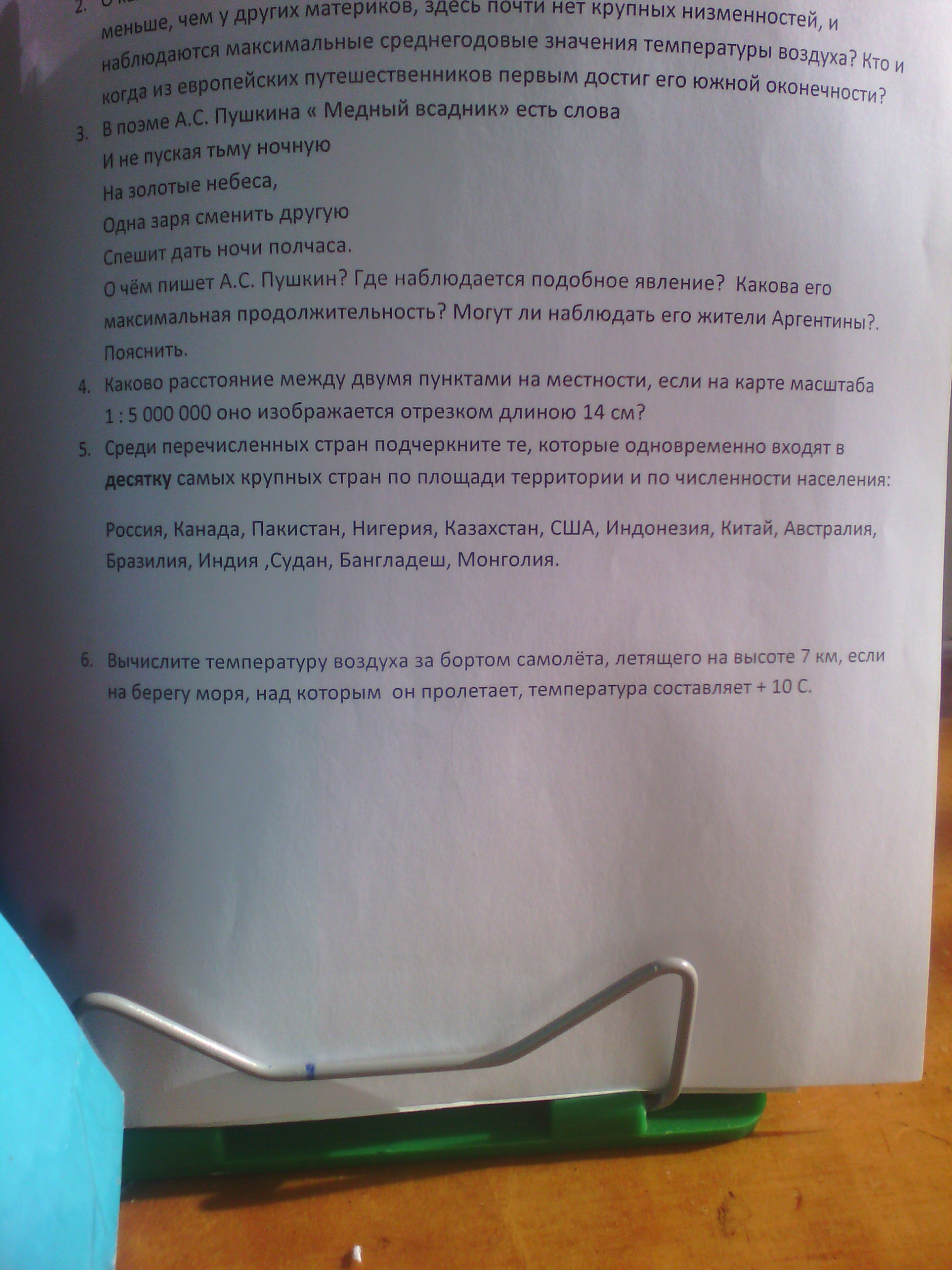 6.Через каждые 1000м,температура меняеться на 6.4 градусов, в зависимости идем ли мы вверх или вниз: 7000/1000=7, 7*6,4=44,8 градуса, 10 градусов-44,8=-34,8 градусов цельсия