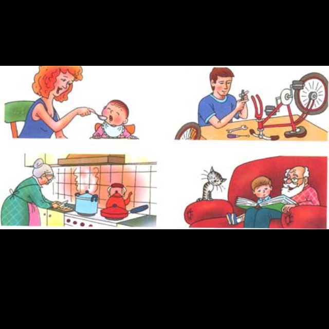 Анам тамақ бісіріп жатыр.Əкем машинасын жөндеп жатыр. Əжем бас киім тоқып жатыр. Атам əкеме көмек темір жатыр. Мен кітап оқып жатырмын.Сіңілім мен інім ойнап жатыр