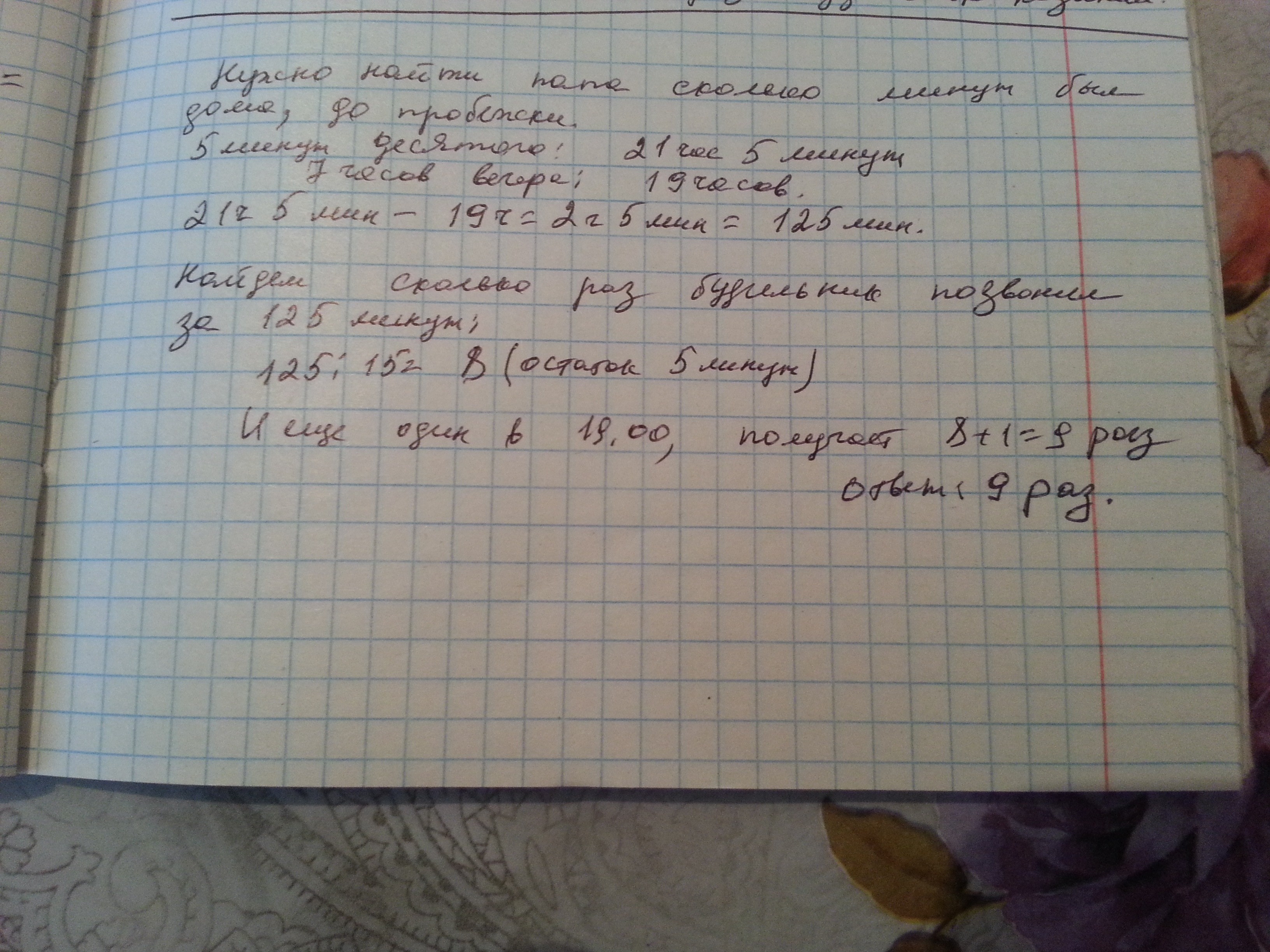 однажды санька и данька починили будильник сначала сломали конечно а потом починили хорошо получилось будильник начал и ткать такать и звонить особенно звонить каждые 15 минут папа пришёл домой в 7 часов вечера как раз будильник звонил а в 5 минут десятого папа решил отправиться на вечернюю пробежку сколько раз звонил будильник с тех пор как папа пришёл с работы и до того как ушёл на пробежку