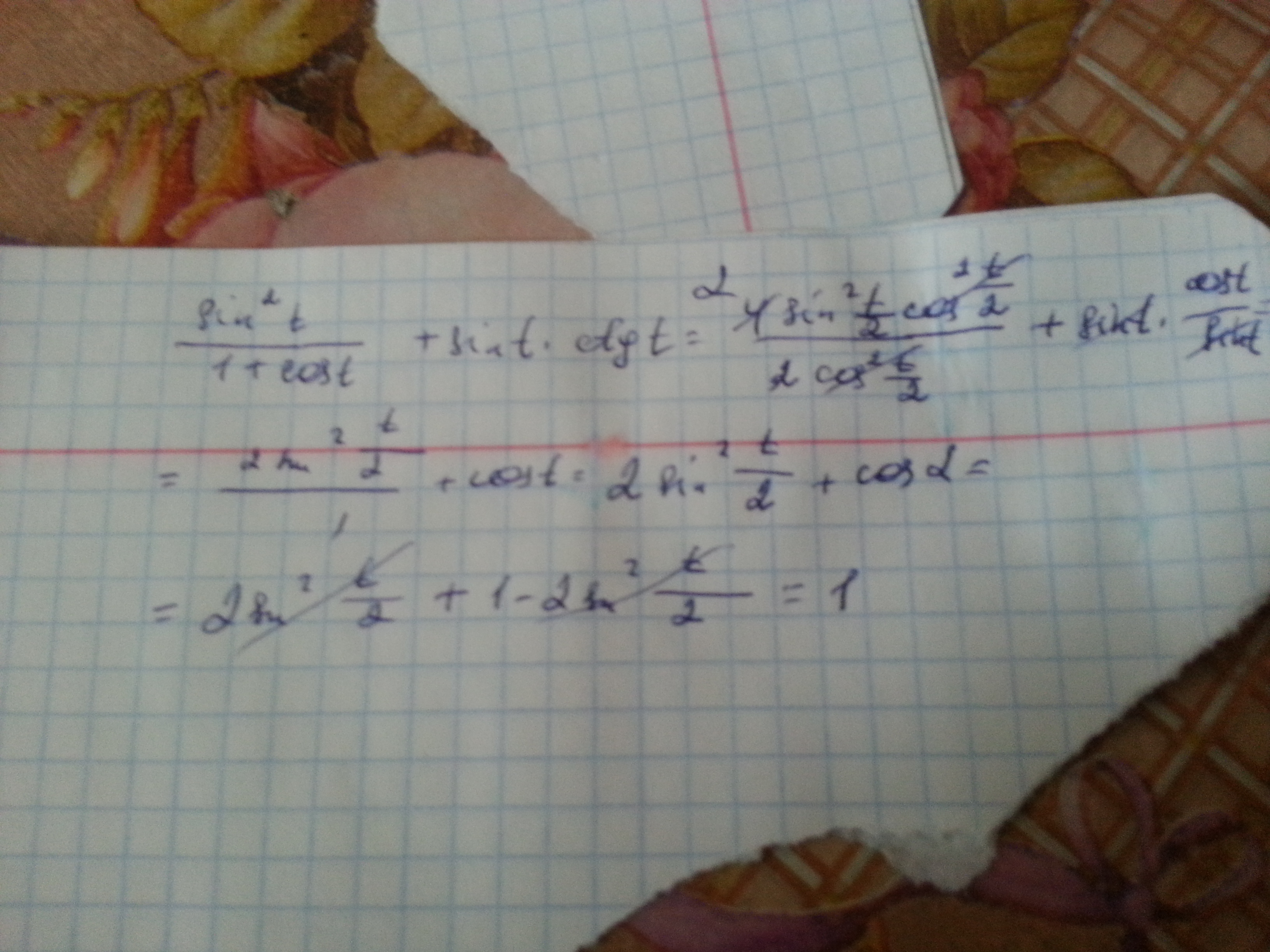 Помогите упростить выражение cin^2 t/1+cos t + sin t * ctg t (здесь син в квадрате t /1+ косинус t записан дробью)