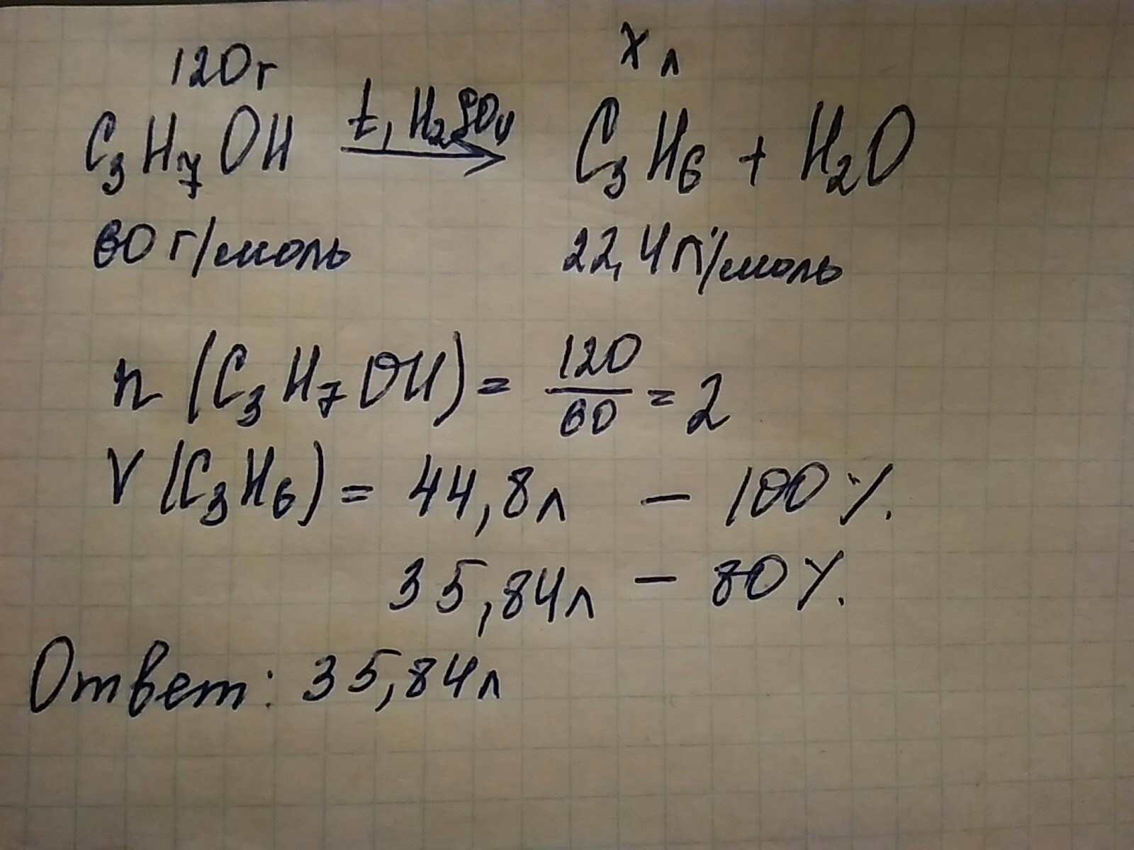 При нагревании пропанола-1 массой 120 г в присутствии концентрированной серной кислоты с выходом 80% получили пропен,объем которого составил....л?