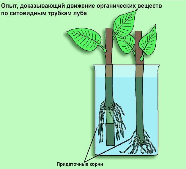 На стебле древесного растения делаем кольцевой надрез. Удалим со стебля кольцо коры. На стебле укрепим стеклянный цилиндр с водой. Ситовидные трубки расположены в лубе. Окольцевав ветку, мы перерезали эти трубки. Органические вещества, оттекающие из листьев, дойдут до раны и будут там накапливаться.