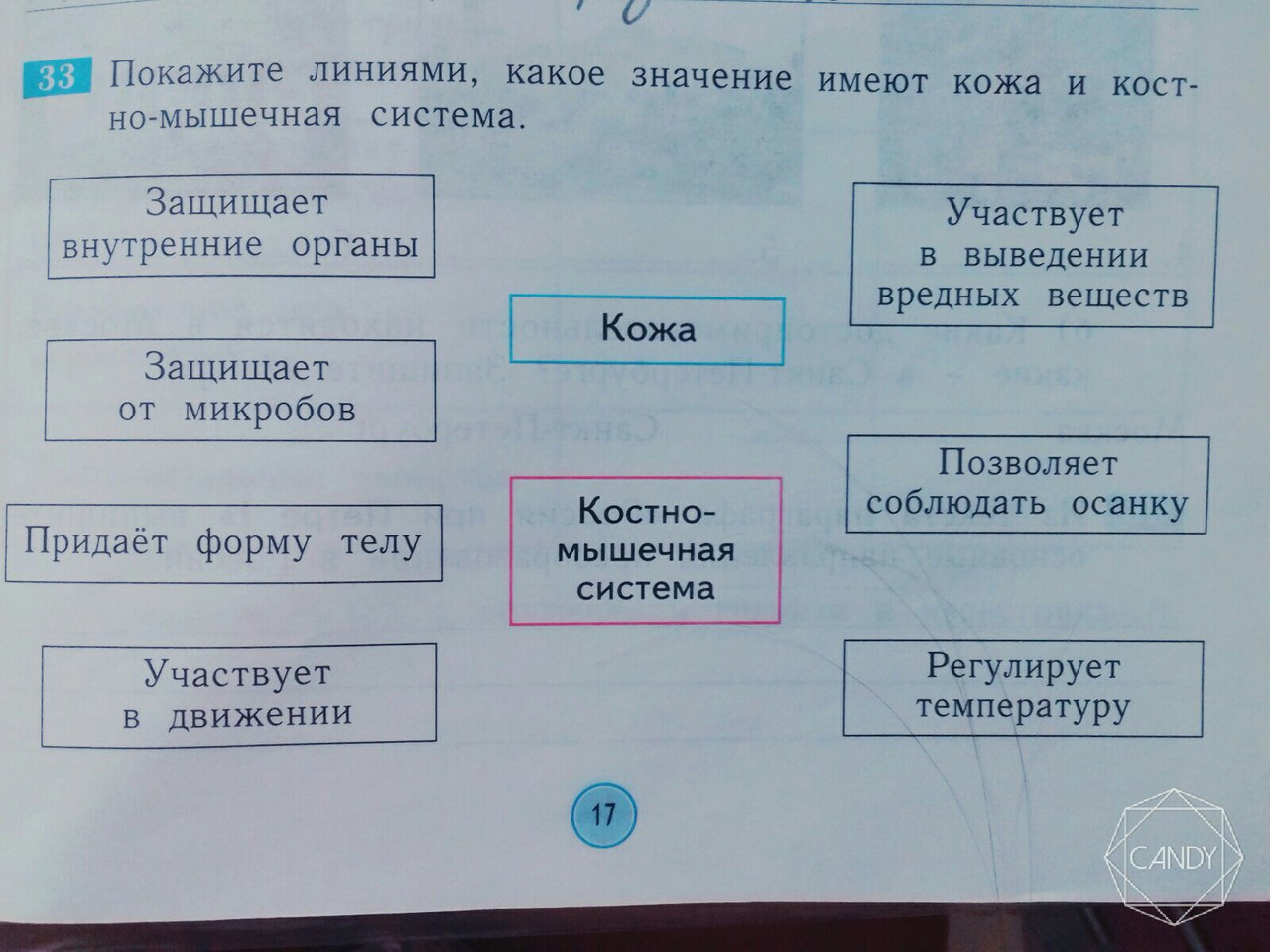 Покажите линиями, какое значение имеют кожа и костно-мышечная система.