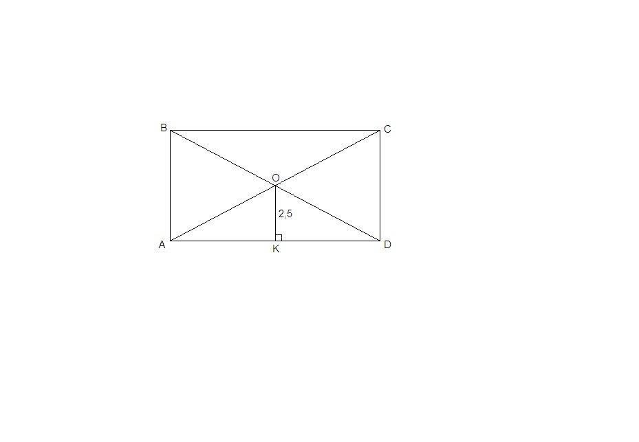 Расстояние от точки пересечения диагоналей прямоугольника до большей стороны равно 2.5 см. Найдите меньшую сторону прямоугольника. Пожалуйста вместе с дано.