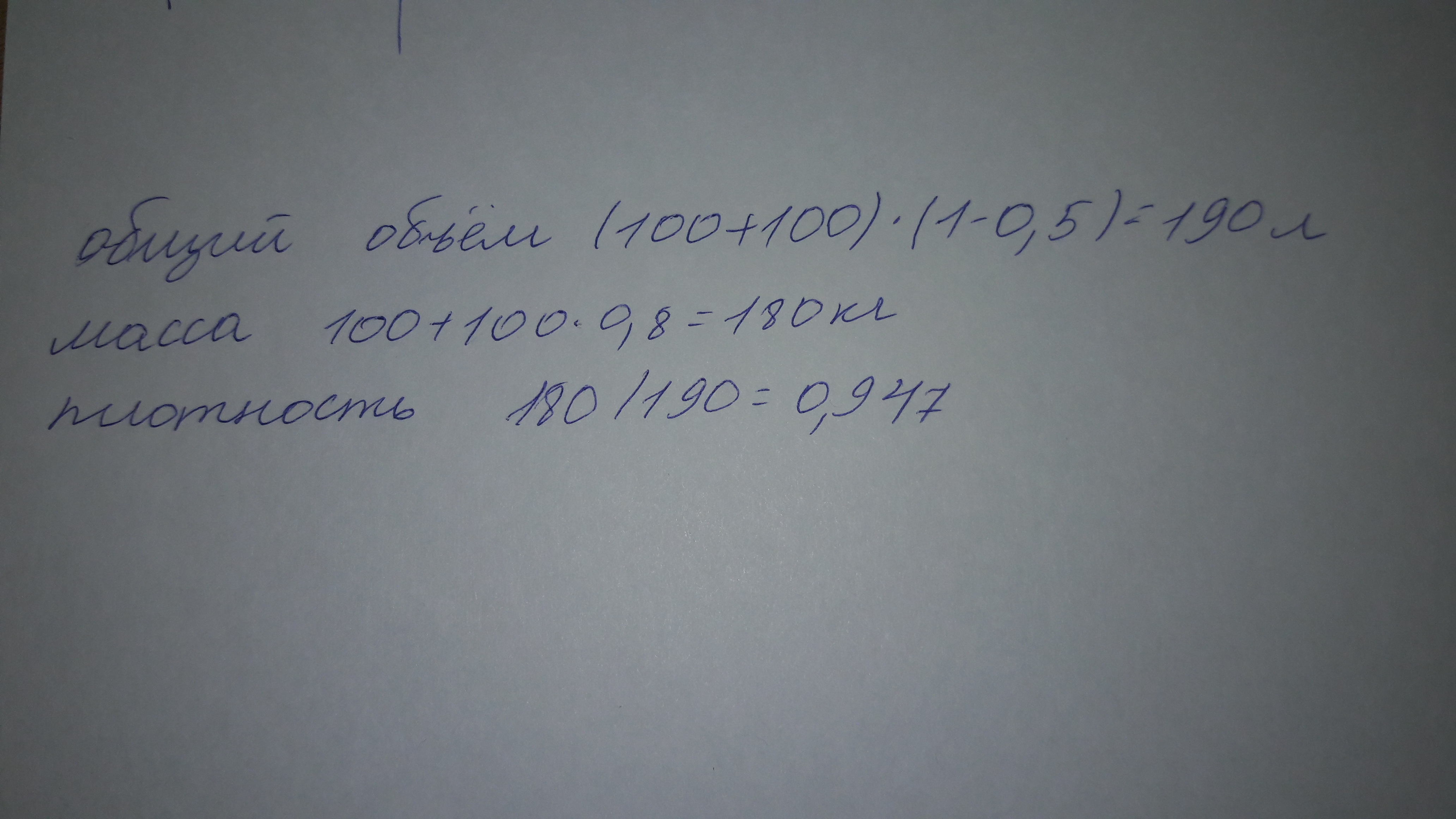 при смешивании 100 литров воды и 100 л спирта плотностью 0,8г/см3 оказалось, что суммарный объём уменьшился на 5%. Какова плотность полученного