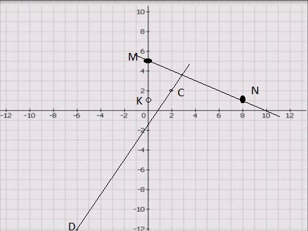 Отметьте на координатной плоскости точки M (0;5),N(8;1),C(2;2),D(-6;-12).Найдите координаты точки пересечения прямых MN и CD.На какой из этих прямых лежит точка K(0;1)?