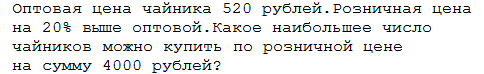 Узнаешь 20% от 520 руб это 104 руб. Розница цена 624 руб. 4000 делим на 624 = 6 чайников.
