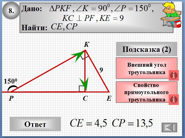 потом как я и писал катет лежащий против угла 30 градусов(угол СКЕ) равен половине гипотенузы(КЕ)