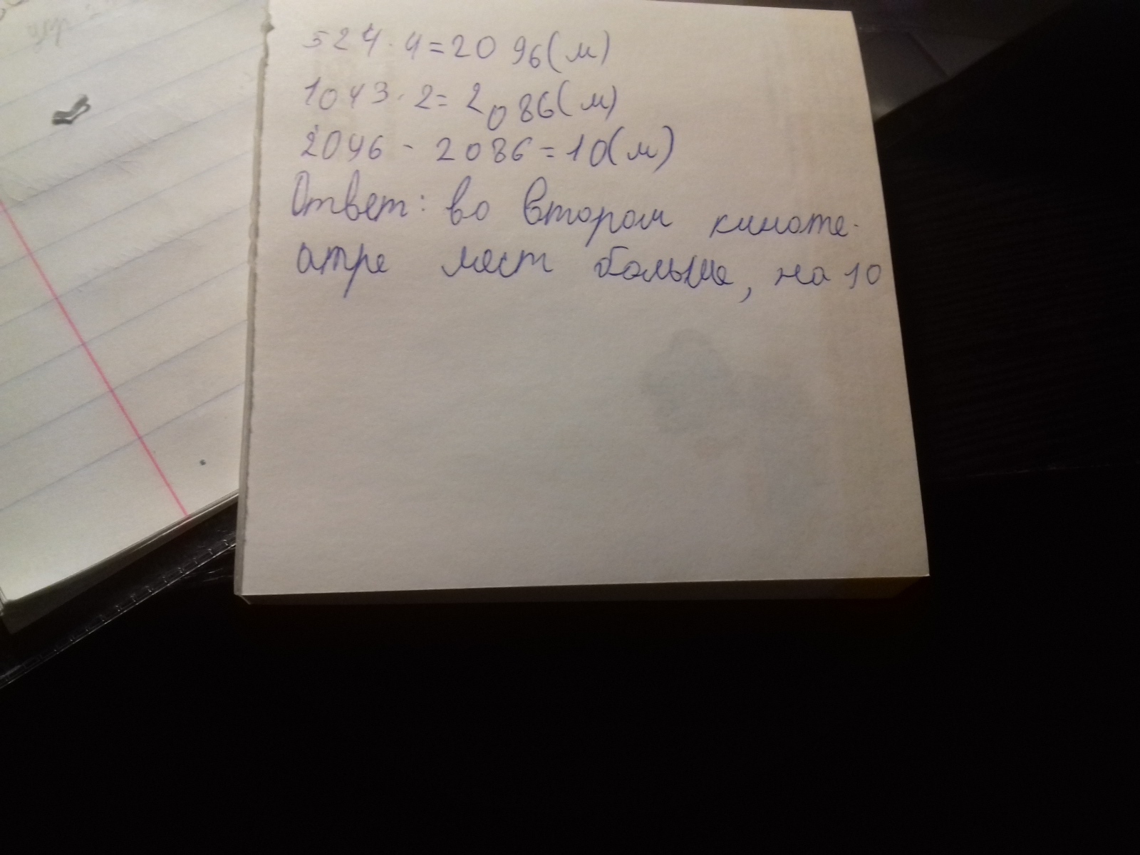 По матиматике помагите решат, в первым кинотеатре 4 зала по 524 места, а во втором - 2 зала по 1043 места. Какой кинотеатре вмещает зрителей больше и на сколько