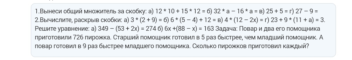 Пусть младший помощник приготовил х пирожков, тогда старший помощник приготовил 5х пирожков, а повар 9х. Всего они приготовили 726 пирожков. Составим и решим уравнение: