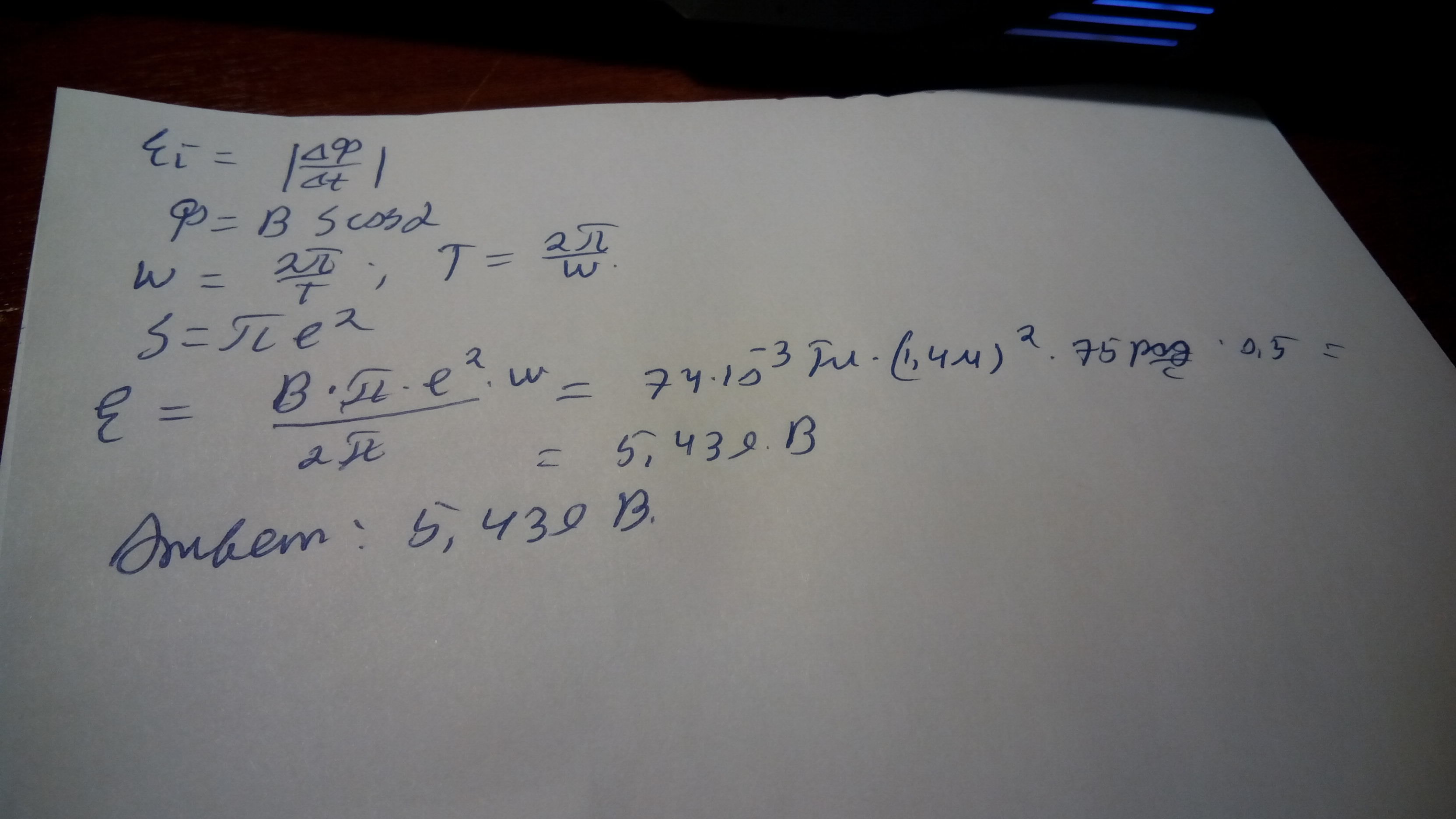 Прямолинейный проводник длиной 1.4 метров находится в однородном магнитном поле с индукцией 74 мТл Найдите разность потенциалов на концах проводника при его вращении с угловой скоростью 75 рад в секунду в плоскости, перпендикулярной магнитному полю.
