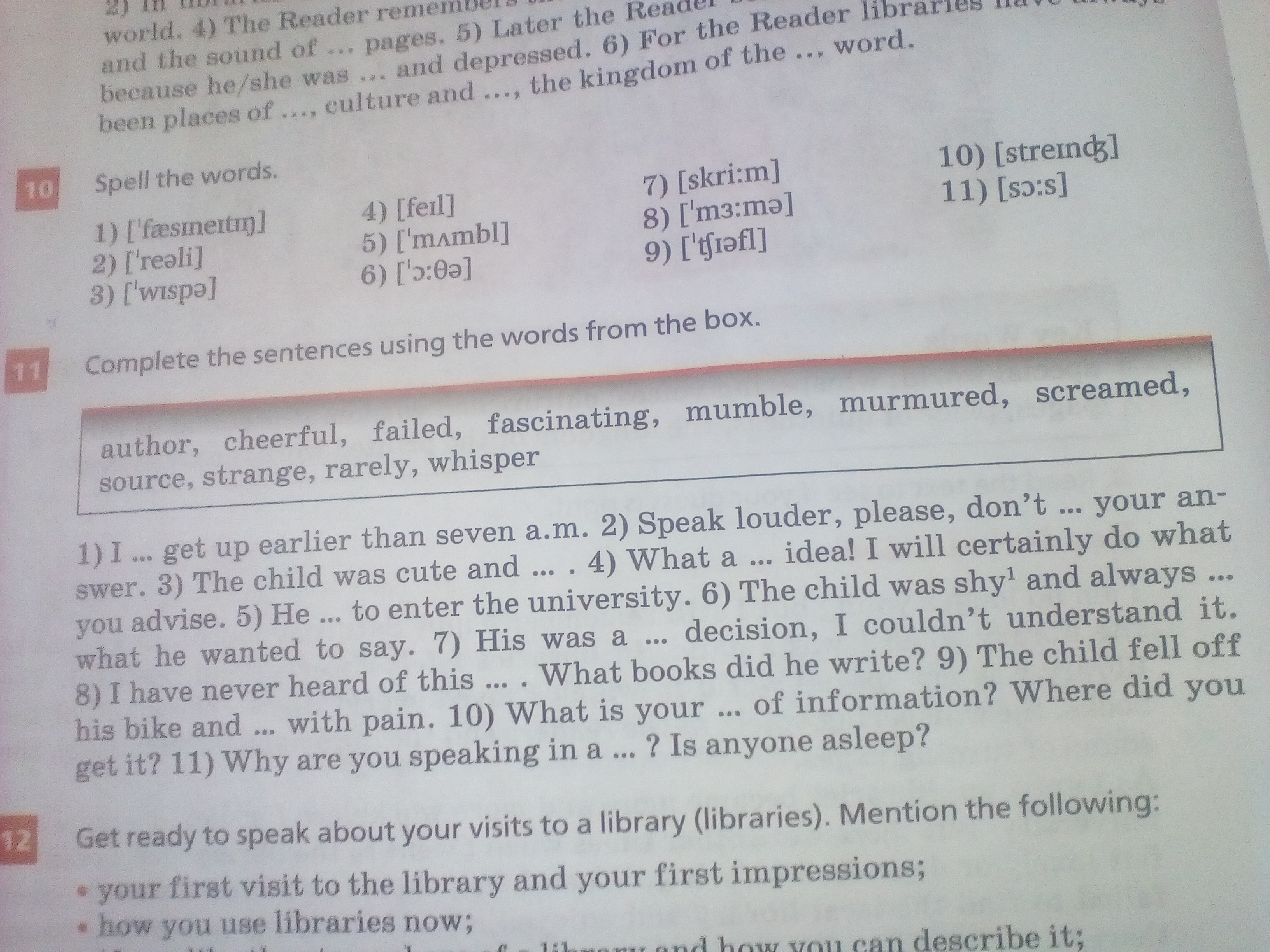 1) rarely , 2) mumble ,3) cheerful 4) fascinating 5) failed 6) murmured 7) strange 8) author 10) source. Надеюсь все правильно но на всякий случай проверь сама или посмотри у других одноклассников тоже )