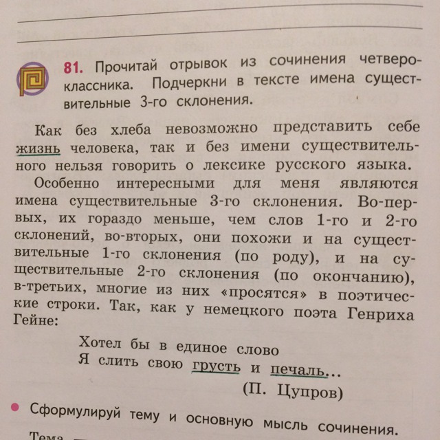 А главная мысль заключается в том, что нам хотят рассказать об особенностях третьего склонения, о том как она похоже на первое и второе, а так же о том, что существительные третьего, склонения так и "просятся" в поэтические строки.