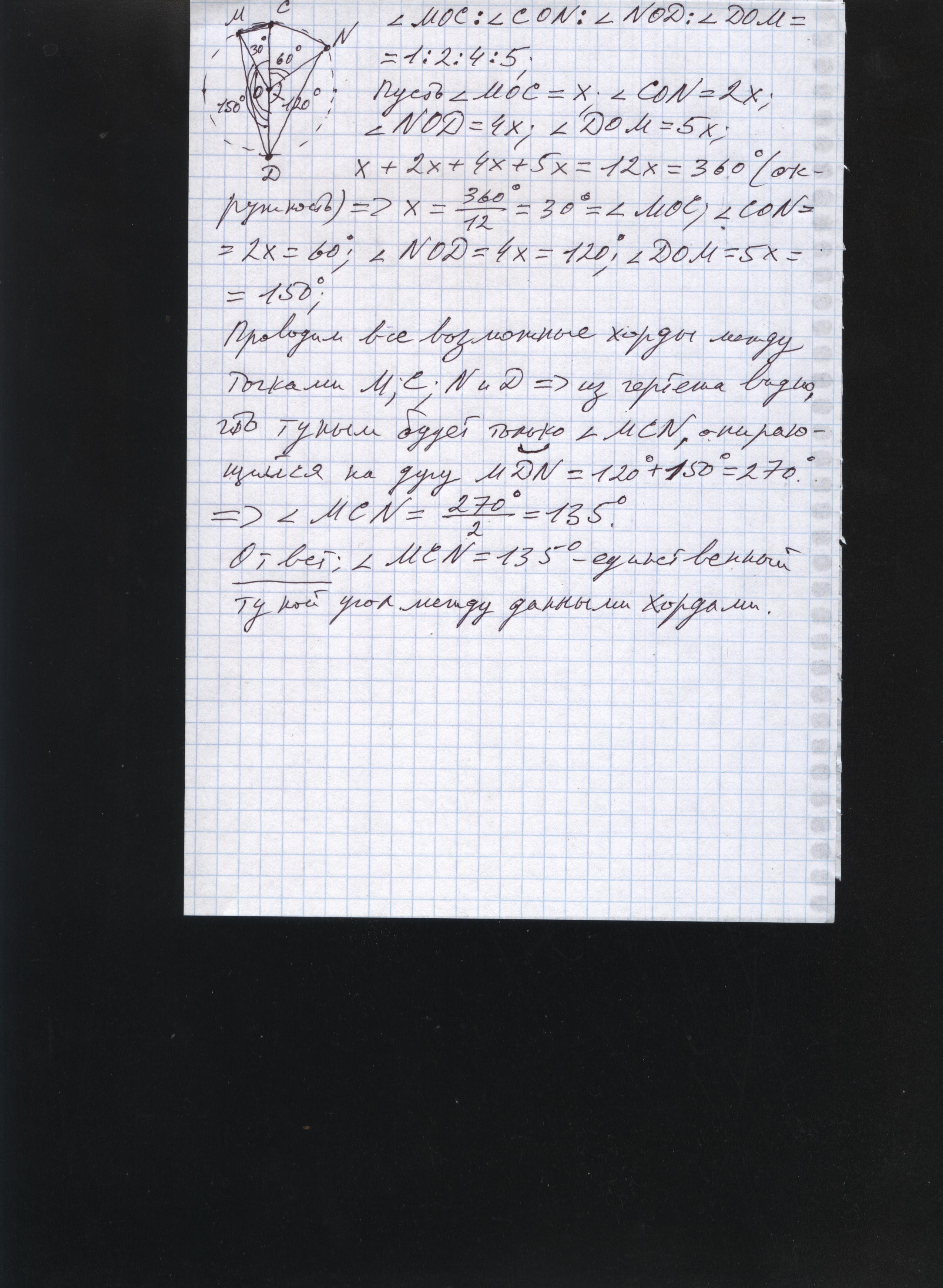 Найти градусную меру тупого угла, образованного этими хордами, если т.М, т.С, т.N и т.D делят окружность на дуги, градусные меры которых пропорциональны числам 1,2,4,5