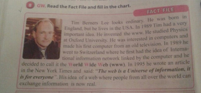 Тим Бернерс-Ли выглядит вполне обычно. Он родился в Англии, но сейчас проживает в штатах. В 1989 году Тима посетила гениальная идея. Он создал Всемирную паутину. В Оксфордском Университете он изучал физику. Он интересовался компьютерами и собрал первый компьютер из старого телевизора. В 1989 году Тим отправился в Швейцарию, где у него впервые возникла идея международной информационной компьютерной сети, и он решил назвать ее Всемирная паутина. А в 1995 он написал статью в Нью-Йорк Таймс, где заявил :"Паутина - это информационная вселенная, и она для всех." Его идея паутины, где люди во всем мире могут обмениваться информацией, вот уже воплотилась в жизнь.