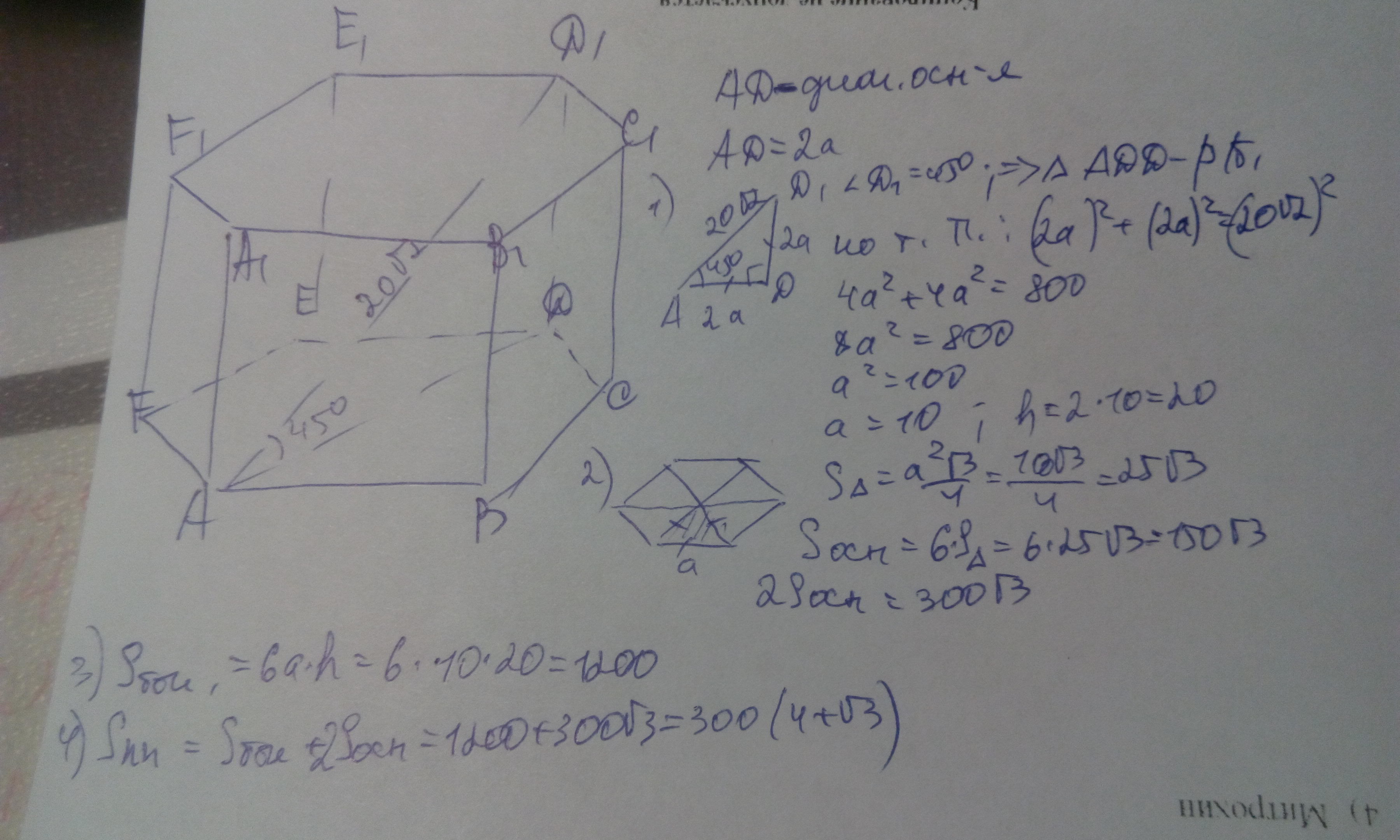Большая диагональ правильной шестиугольной призмы равна 20в корне из 2 см и наклонена к плоскости основания под углом 45 градусов. Вычислите площади боковой и полной поверхности призмы.