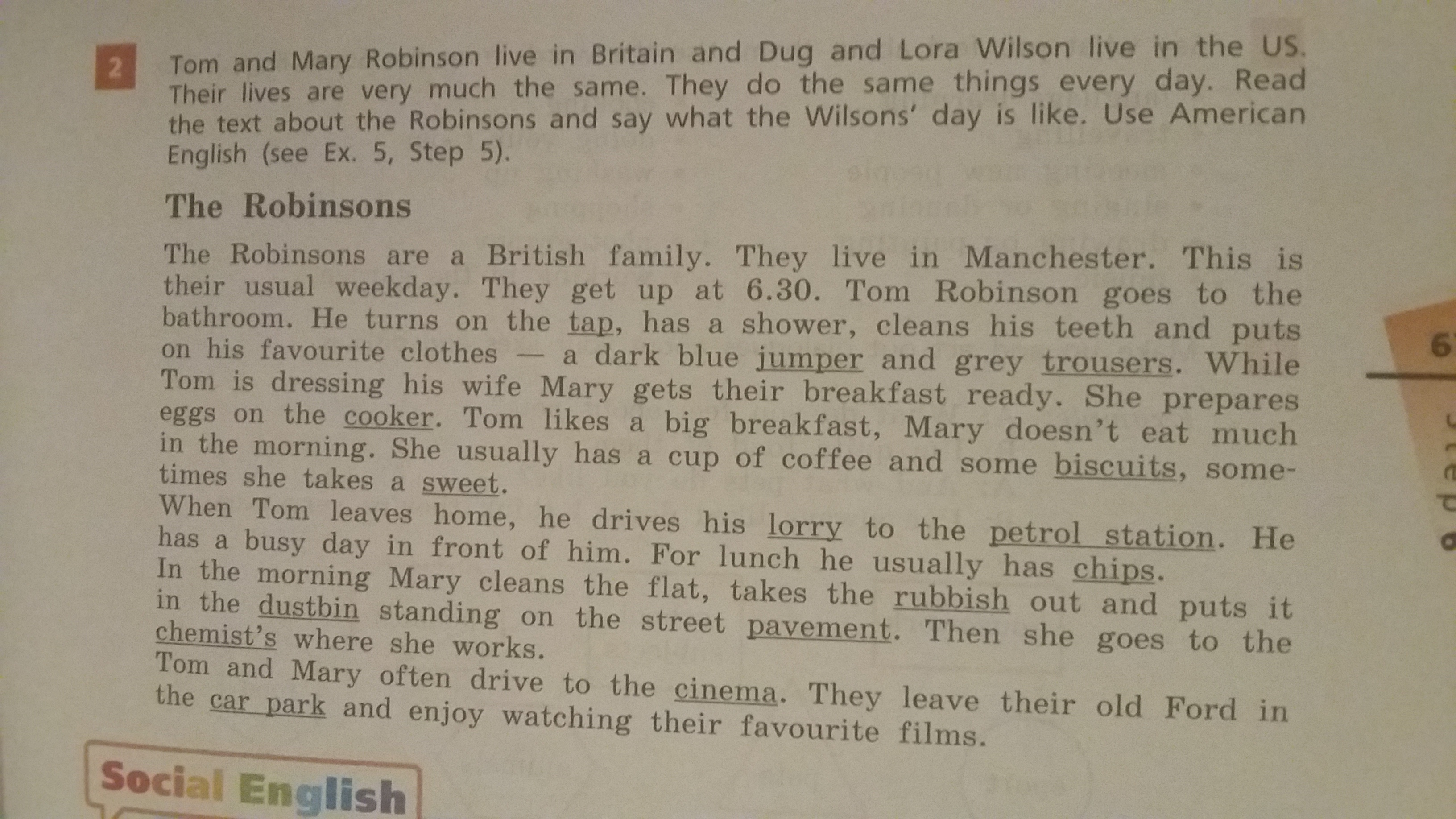 Они английская семья. Они живут в Манчестере и вот их обычный день.Они встают в 6-30 . Том идет в ванную, он включает кран , принимает душ , чистит зубы и надевает свою любимую одежду - темно синий свитер и серые брюки Пока он собирается , Мэри готовит им завтрак Она готовит на плите яйца . Том любит большие завтраки, а Мэри не ест много утром. Обычно это чашка кофе и несколько печений , иногда сладости.