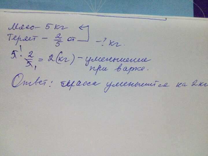 ответ 2 килограмма теряется при варке мясо, если 5 кг разделить на 5 частей а при варке теряется 2/5 части мясо, то получается что из 5 частей мясо 2 потерялись и осталось 3, 5-2=3