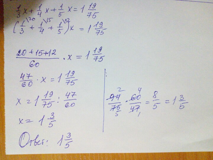 числа содержащие одинаковую букву называются подобные, их можно складывать и отнимать. В данном уравнении подобные числа содержат букву х. Для того чтобы их сложить мы должны привести эти дроби к общему знаменателю, т.е. найти то число которое бы делилось без остатка на знаменатели всех подобных дробей. Это число 60. Оно делится и на 3,и на 4, и на 5. Получим 20/60х+15/60х+12/60х=1 19/75