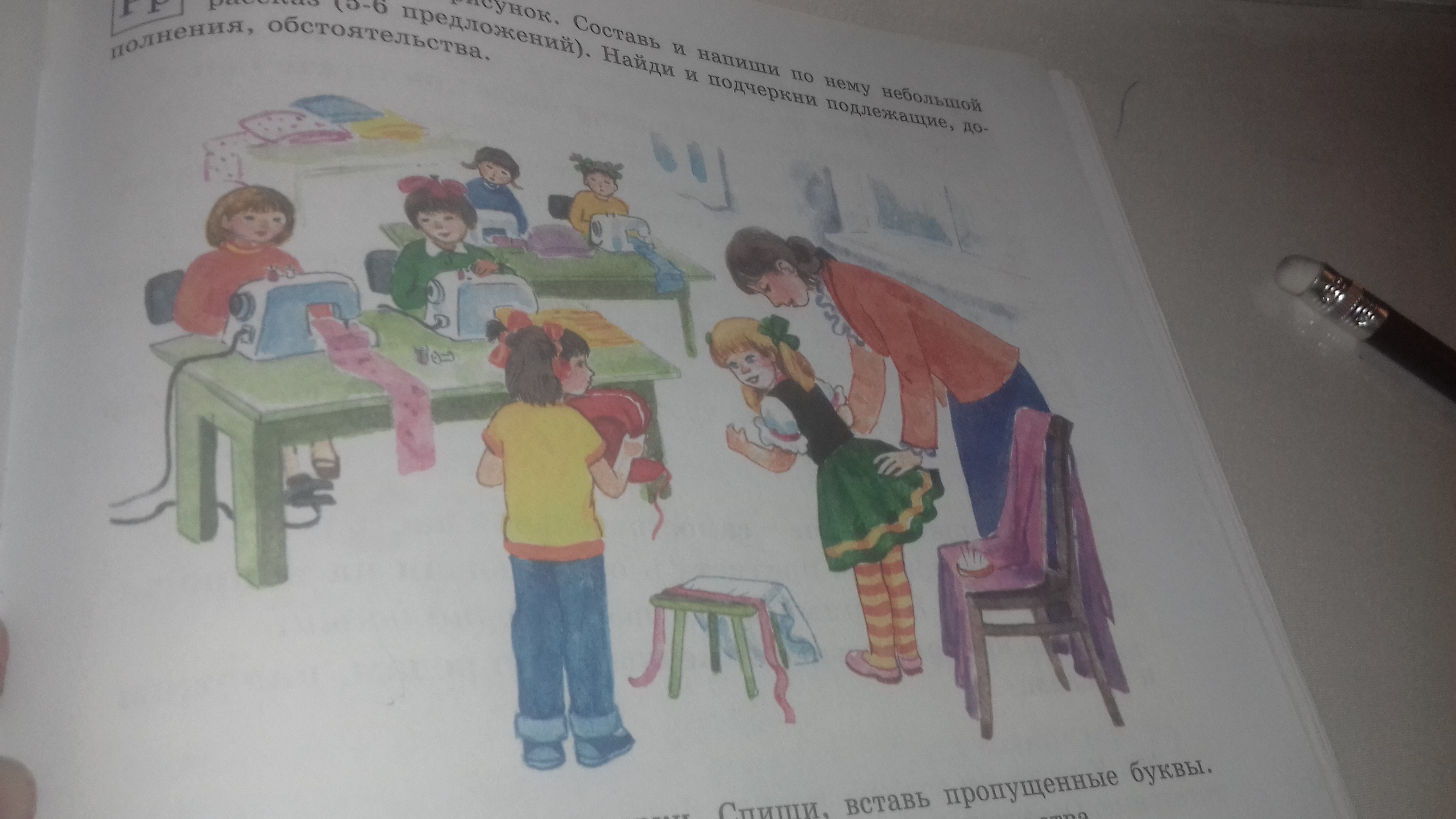 Дети пришли на урок труда(технологии )и сели за парты.Им учительница сказала что-бы шили юбку.Дети приступили к работе.Девочка по имени (имя)первая закончила шить юбку,и пошла показывать учителю.Юбка уже была одета на (имя).Учитель похадил вокруг (имя) и похвалила (имя).(Имя)была очень рада!