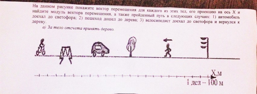 на данном рисунке покажите вектор перемещения для каждого из этих тел,его проекцию на ось Х найдите модуль вектора перемещения ,а так же пройденный путь в следующих случаях 1)автомобиль доехал до светофора .2)пешеход дошёл до дерева.3)велосипедист доехал до светофора и вернулся к дереву.