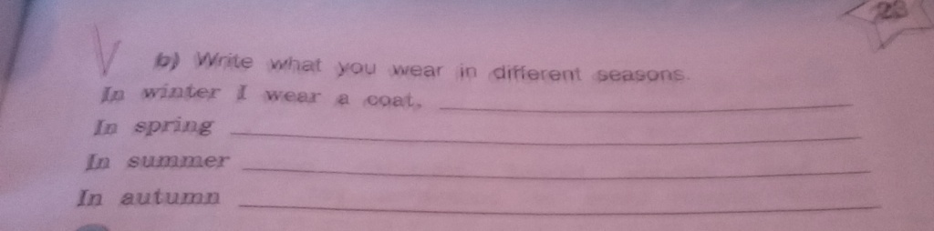 4)In autumn I wear waterproof boots, a warm jeans, a jacket and a hat