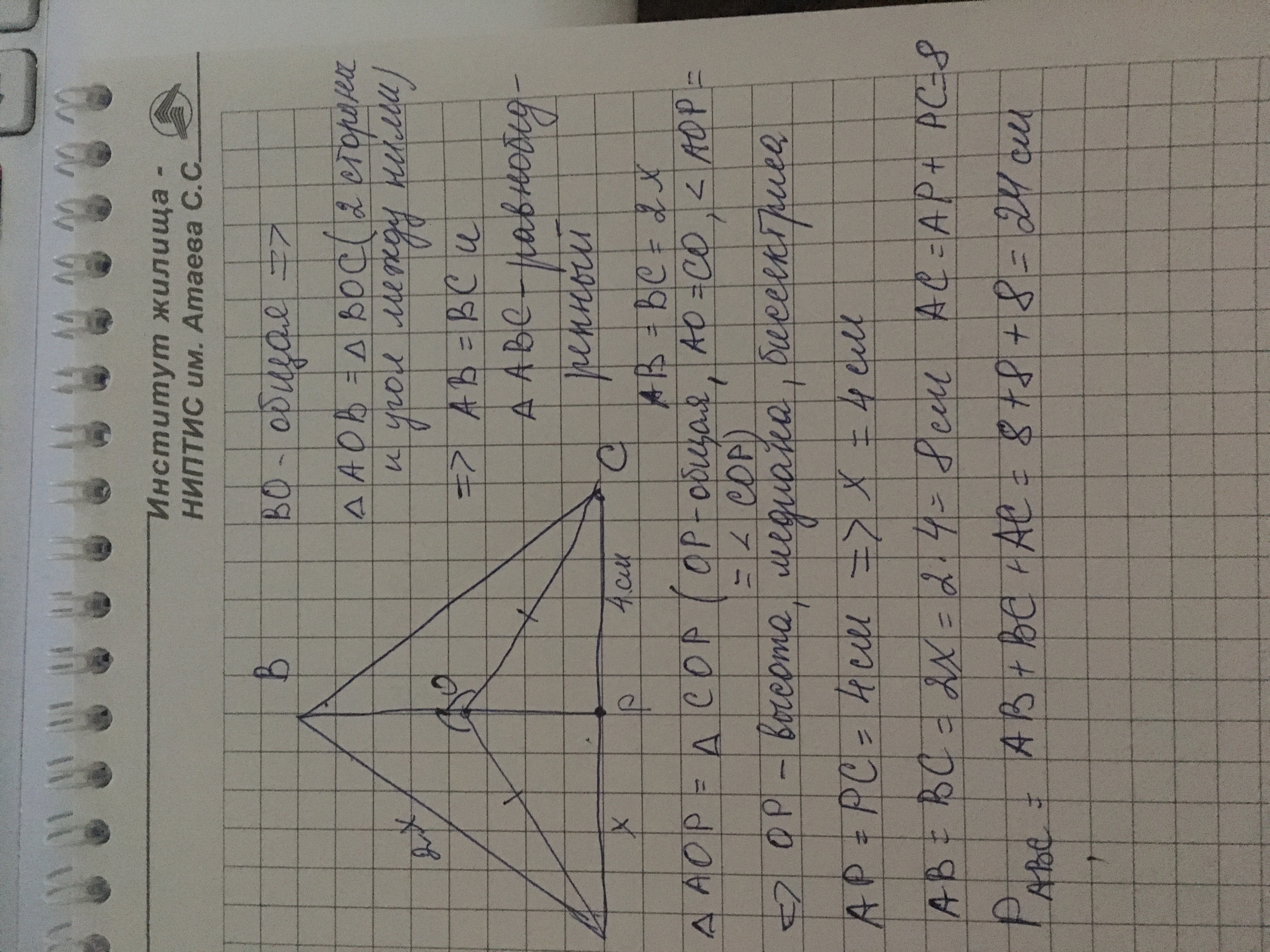 Точка P лежит на стороне треугольника ABC, а точка О лежит на отрезке BP так, что АО= ОС и угол AOB = углу BOC. Вычислите периметр треугольника ABC, если известно, что AB=2AP и PC= 4см