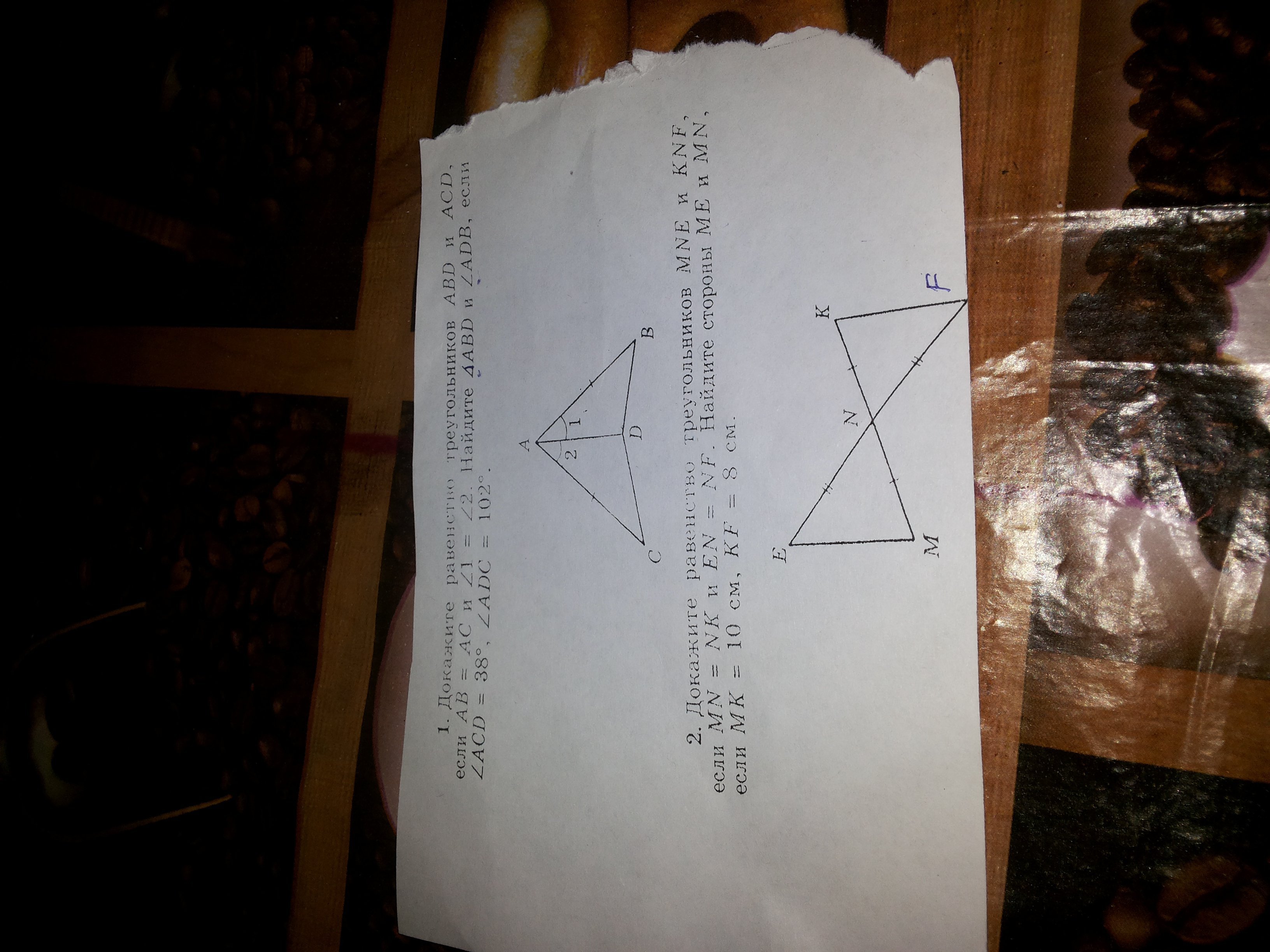 1)MN=NK,FN=EN,угол FNM=угол KNF-как вертикальные. Значит, ∆MNE=∆KNF по двум сторонам и углу между ними.