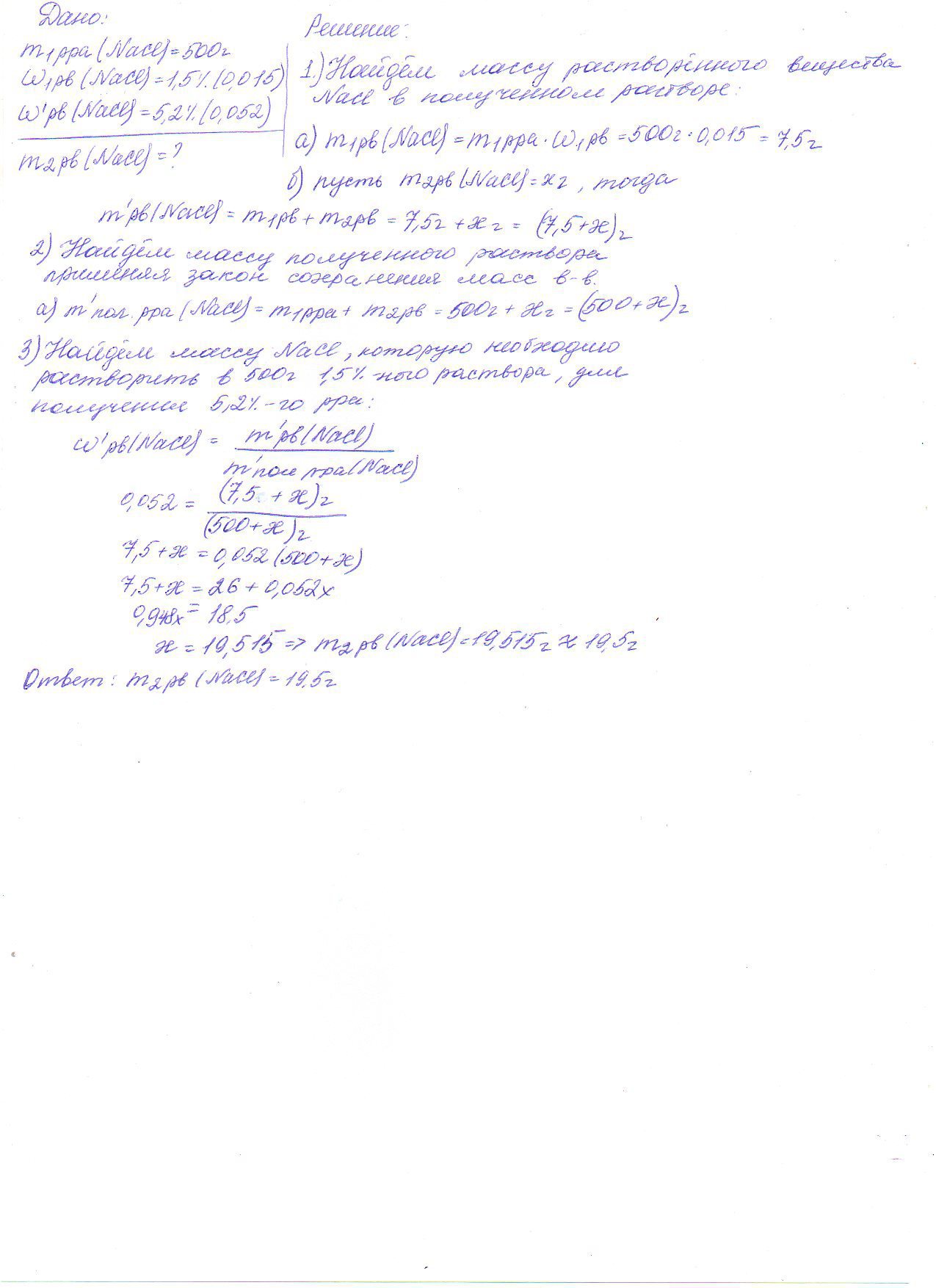Сколько граммов хлорида натрия нужно растворить в 500 г 1,5 % раствора этой же соли , чтобы получить 5,2 % раствор ?
