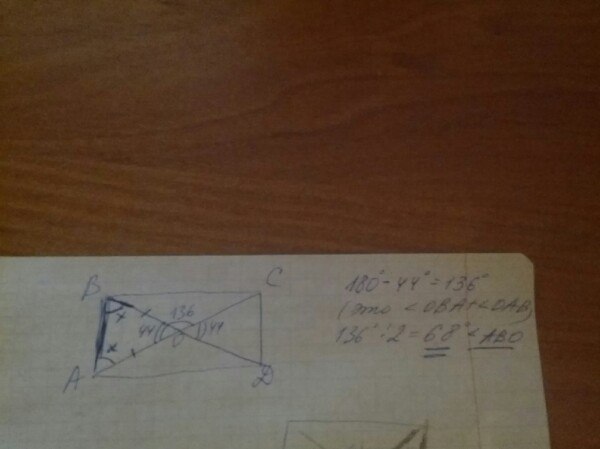 В прямоугольнике угол между диоганалями равер 136 градусов.Найти угол между диагональю и меньшей стороной прямоугольника