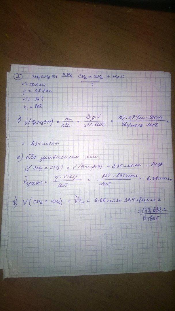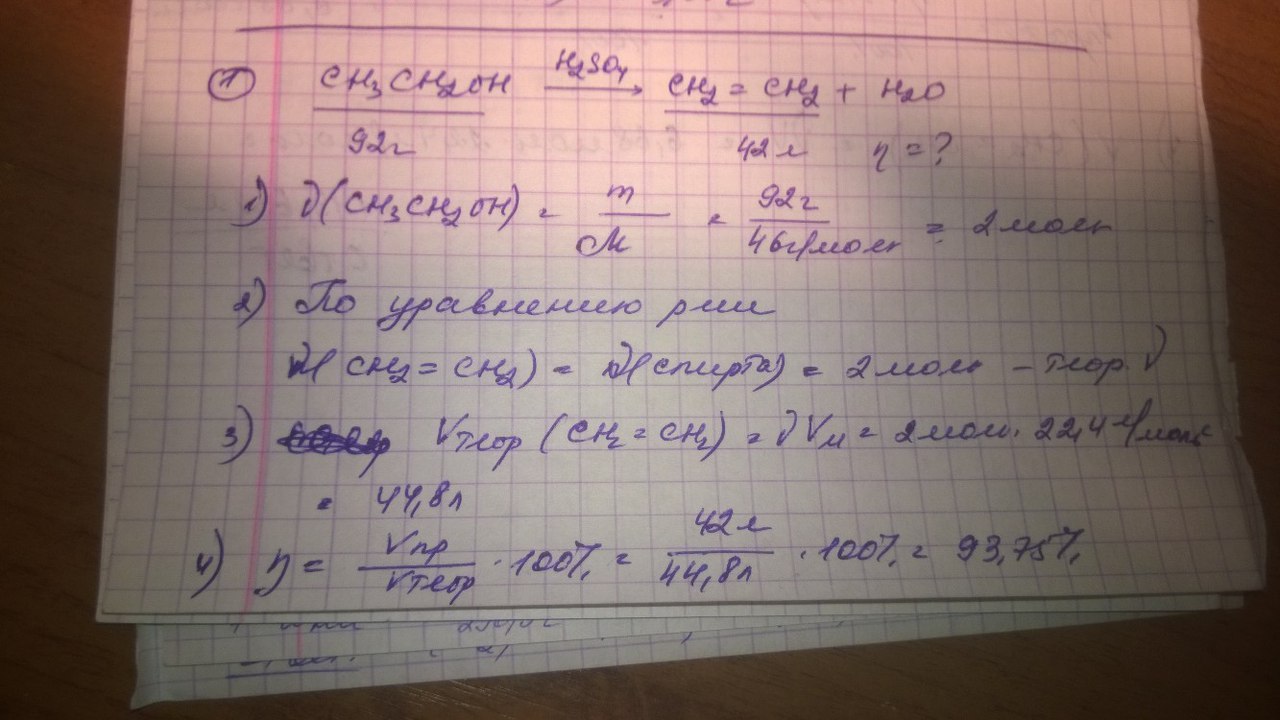 Помогите решить . 1) Из 92 г этанола получили 42 л этена. Найдите выход реакции(%). 2) Какой объем этена можно получить из 500 мл( вместительность 0.8г/мл) 96% концентрации раствора этанола,если выход реакции равен 80%?