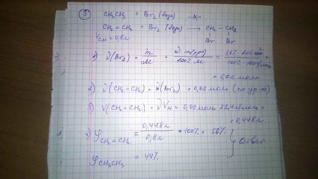 3) 0,8 л смеси этана и этена пропустили через 200 г 1,6% концентрации бромовой воды. Посчитайте состав смеси этана и этена