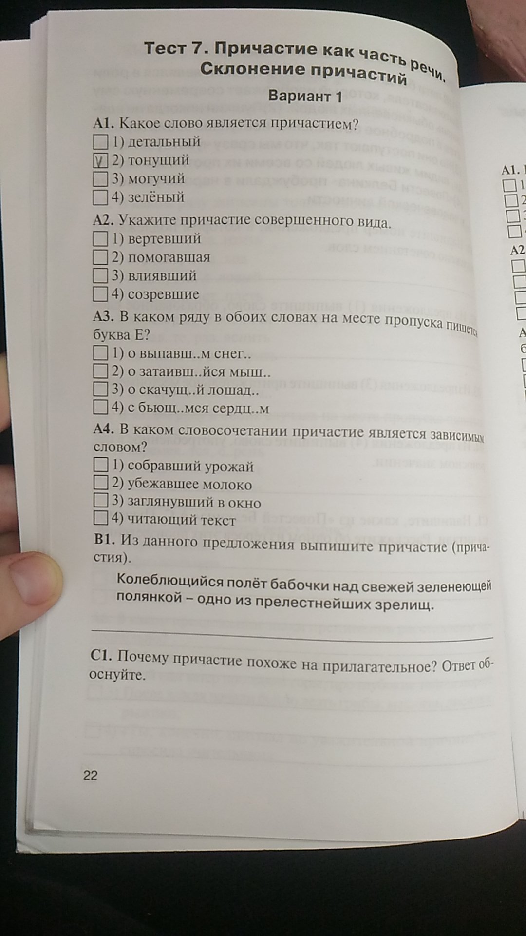 С1 - Причастие похоже на прилагательное, так как также как прилагательное причастие может изменяться по падежам, числам и в ед.ч. по родам.