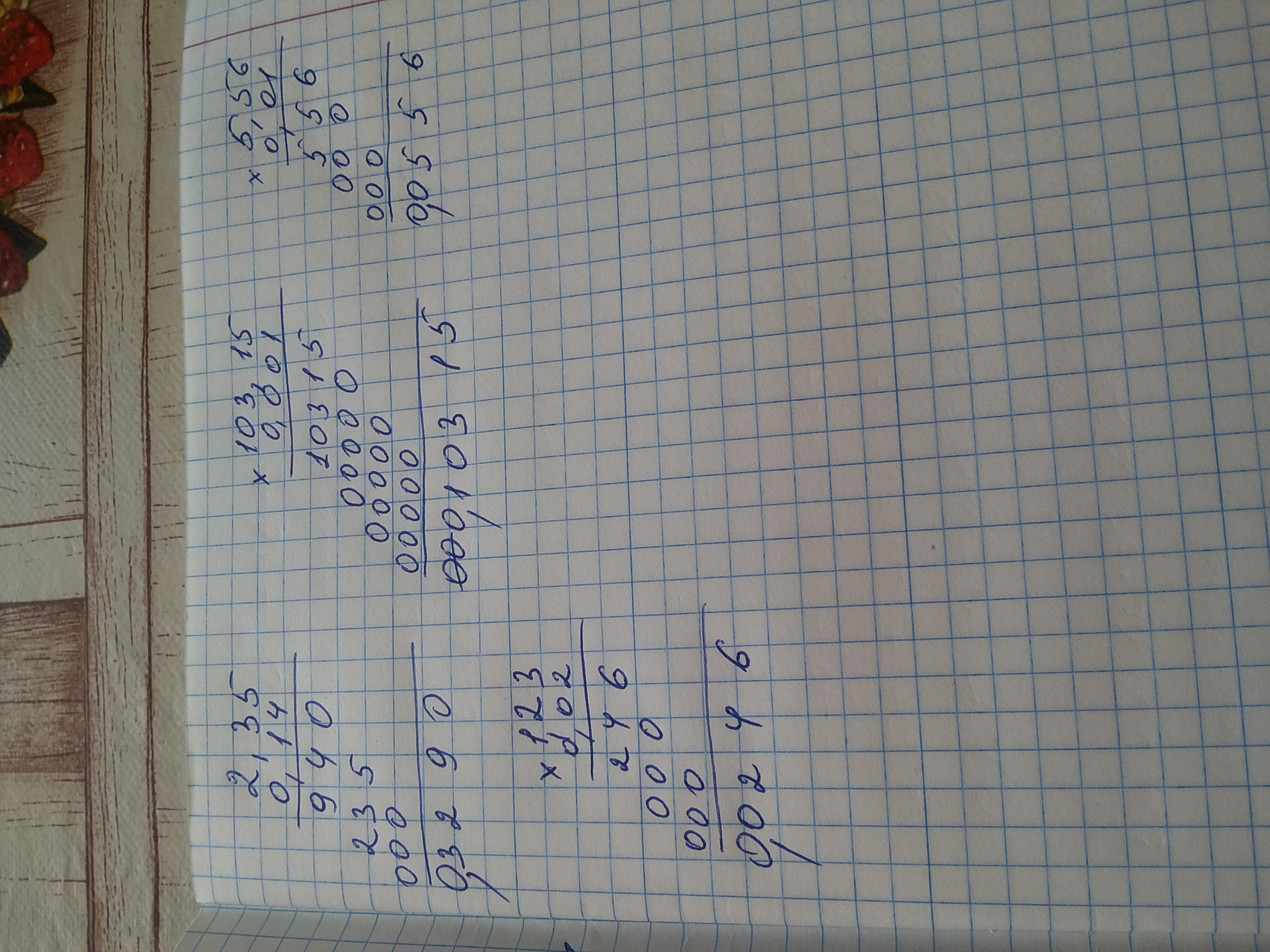 Вычислите:и)2,35*0,14;к)103,15*0,001;л)5,56*0,01;м)1,23*0,02. Решите в столбик и пришлите фото решения.Пожалуйста!