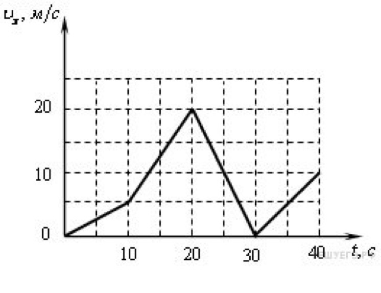 Ускорение мало там, где график самый пологий, там скорость изменяется медленно. Это участок, который тело прошло в первые 10с; а=5-0/10=