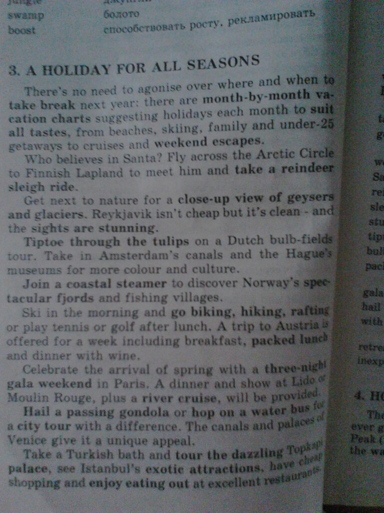 3. ПРАЗДНИК ДЛЯ ВСЕХ СЕЗОНАМ Там нет необходимости мучиться над тем, где и когда va- взять перерыв в следующем году: есть праздники каждый месяц, чтобы удовлетворить предлагая катиона чарты любой вкус, от пляжей, катание на лыжах, семьи и детей в возрасте до 25 бегства на круизы и в выходные дни убегает. хо верит в Санта? Летайте через Полярным кругом в финской Лапландии, чтобы встретиться с ним и взять поездку оленьей упряжке. Получить рядом с природой для крупным планом гейзеров Рейкьявик не дешево, но это чистый и и ледники. достопримечательности являются ошеломляющими. Tiptoe через тюльпаны на голландских колба полей и каналов тур Гаага Амстердам. Возьмите в nmuseums для большего количества цветов и культуры. Присоединяйтесь к прибрежному пароварку, чтобы обнаружить Шпее tacular фьорды Норвегии и рыбацкие деревни. Горнолыжная утром и идти на велосипеде, пеший туризм, рафтинг или поиграть в теннис или гольф после обеда. Поездка в Австрию предлагается в течение недели, включая завтрак, упакованный обед и ужин с вином отпраздновать приход весны с тремя nighi гала выходные в Париже. Ужин и шоу в Лидо Мулен Руж, а также речной круиз, будет радуйся проезжает полувагоны или прыгать на водном автобусе на экскурсию по городу с разницей. Каналы и дворцы Венеции придать ему уникальную привлекательность. Примите ванну и совершить поездку по ослепительные вершины дворец, увидеть экзотические достопримечательности Стамбула, имеют по магазинам и наслаждаться едой на превосходных Рез