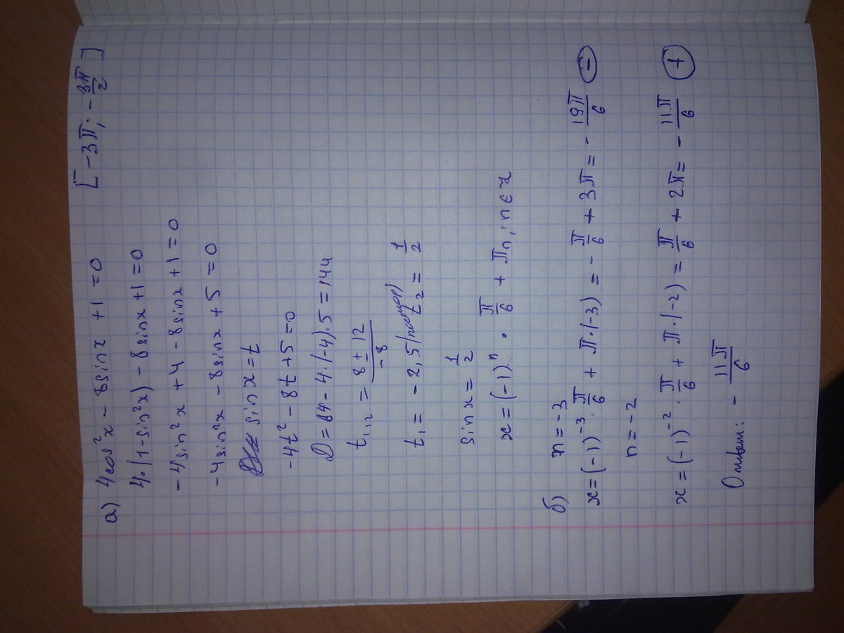 a) Решите уравнение: 4cos2x - 8sinx + 1= 0 б) Найдите все корни этого уравнения, принадлежащие отрезку [-3П;-3П/2]