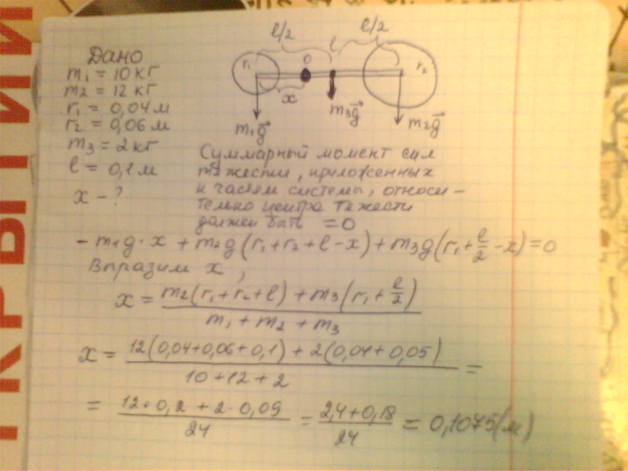 Два однородных шара массами 10 кг и 12 кг, радиусами 4 см и 6 см соединены посредством однородного стержня массой 2 кг и длиной 10 см. Центры шаров лежат на продолжении оси стержня. Найдите положение центра тяжести системы.