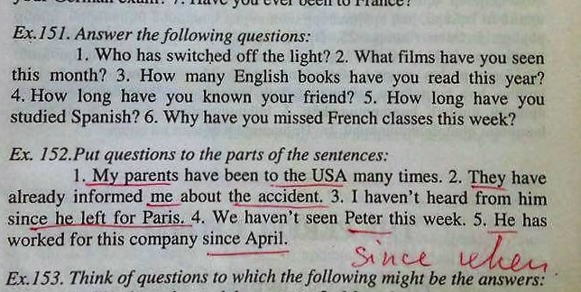 1 who has been to the USA many times? What country have my parents been to many times? 2 who has already informed me about the accident? who has already been informed about the accident? 3 When did you hear from him last? 4 Have you seen Peter this week? 5 Since when has he worked for this company?