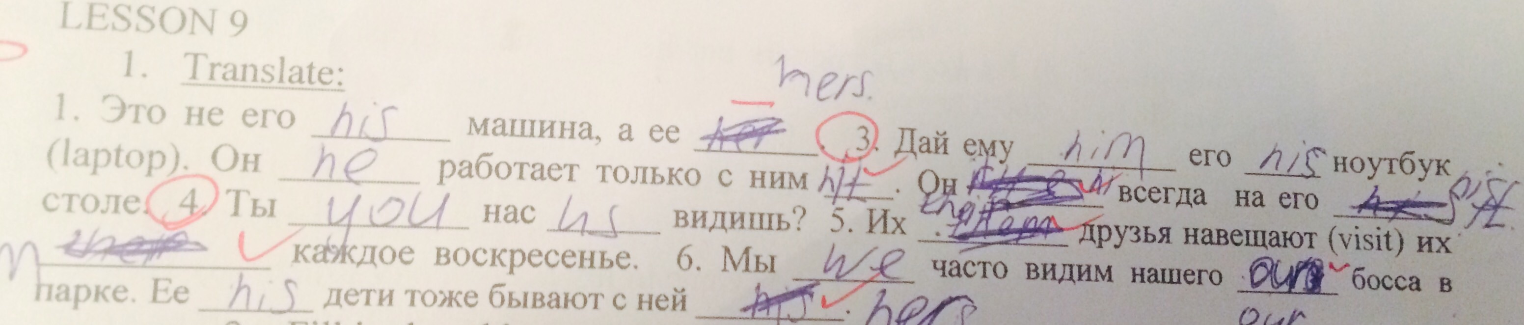 1) this isn't his it is hers 3) give him his laptop -- he onlu works with him -- he is always on his desk 4) do you see us? 5)their friends come to visit them every Sunday 6)we often see our boss in the park -- her childreen are with her,too вот так
