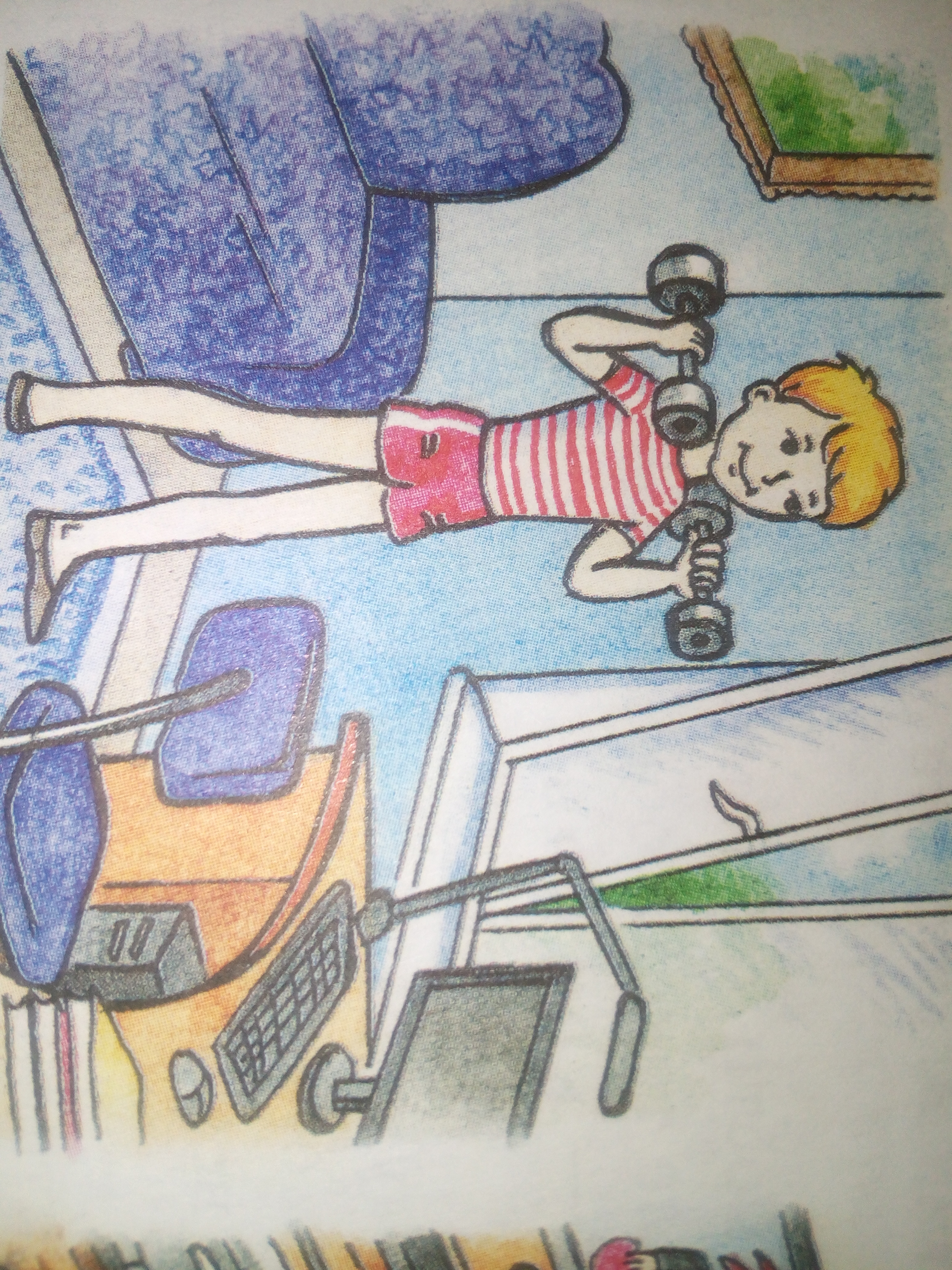 Я встаю с утра и делаю зарядку поднимаю гантельки присидаю отжимаюсь. Потом я сажусь на диван и смотрю телевизор когда по телевизору ничего нет я играю во всякие игры сижу в интернете вот что изображено на рисунке