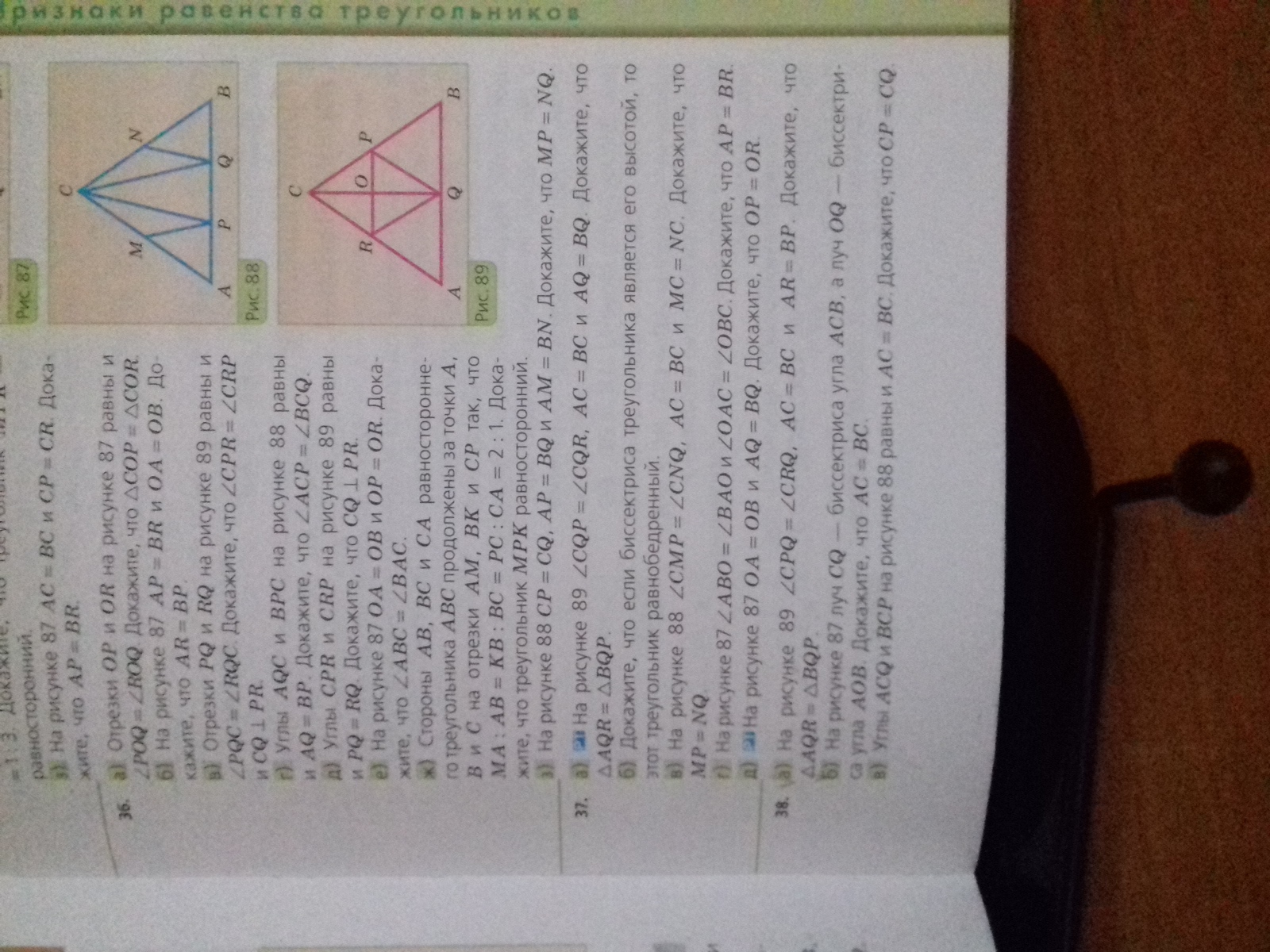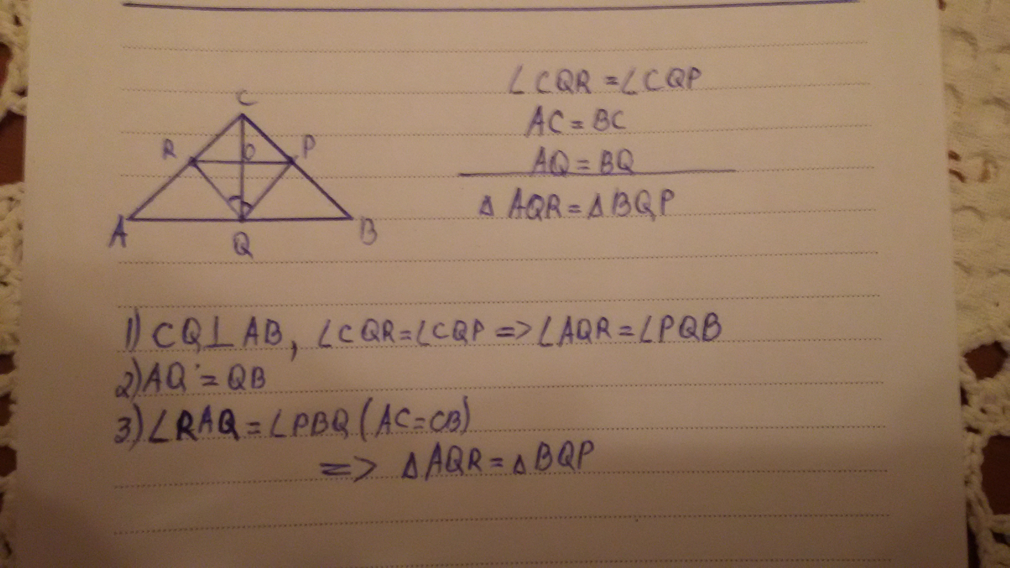 на рисунке 89 угол CPQ=углу CRQ,AC=BC и AR=BR.Докажите , что треугольник AQR=треугольнику BQP