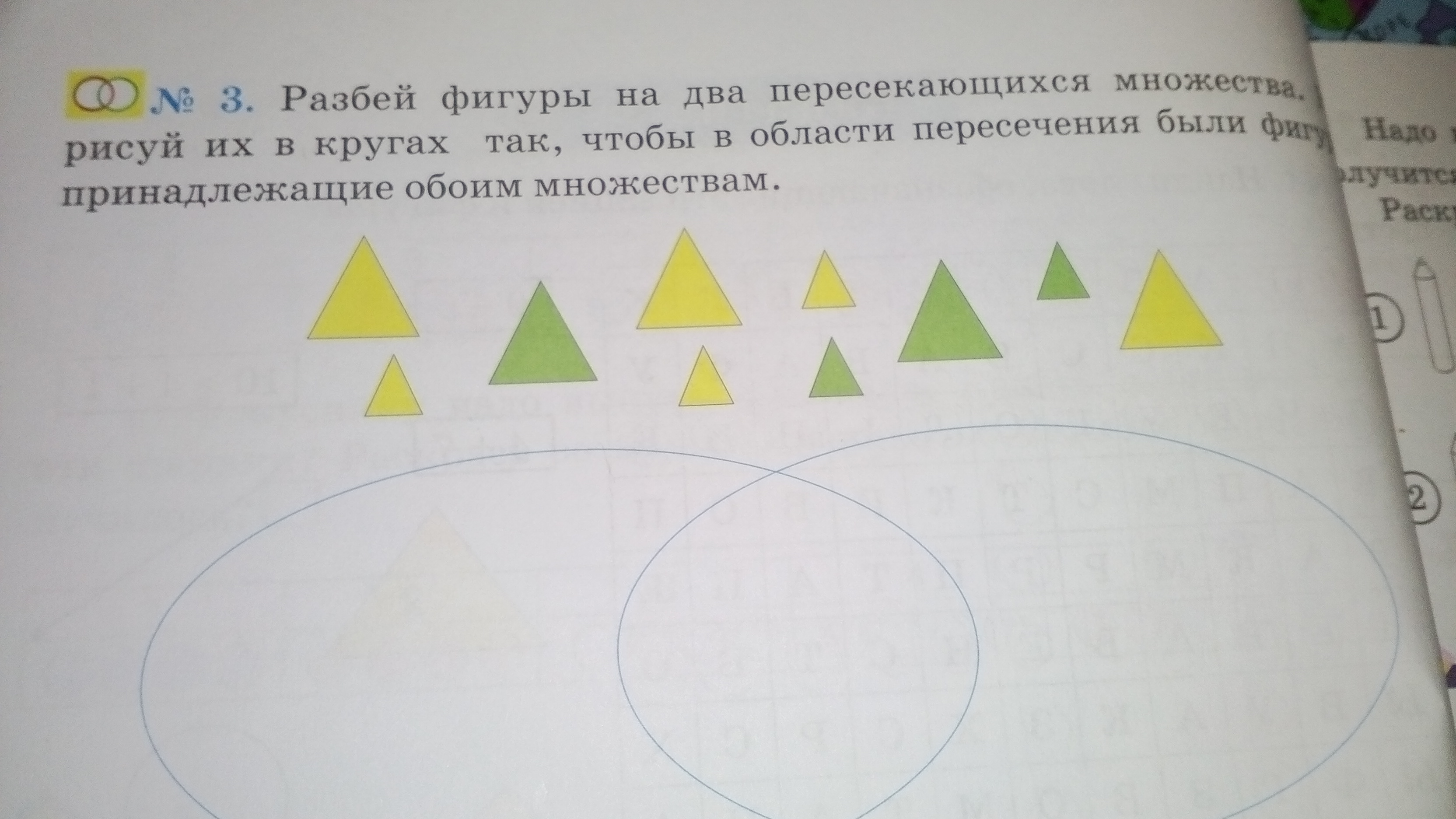 Я думаю,что в обои множества и область пересечения будут входить все жёлтые треугольники .А зелёные только в область множеств